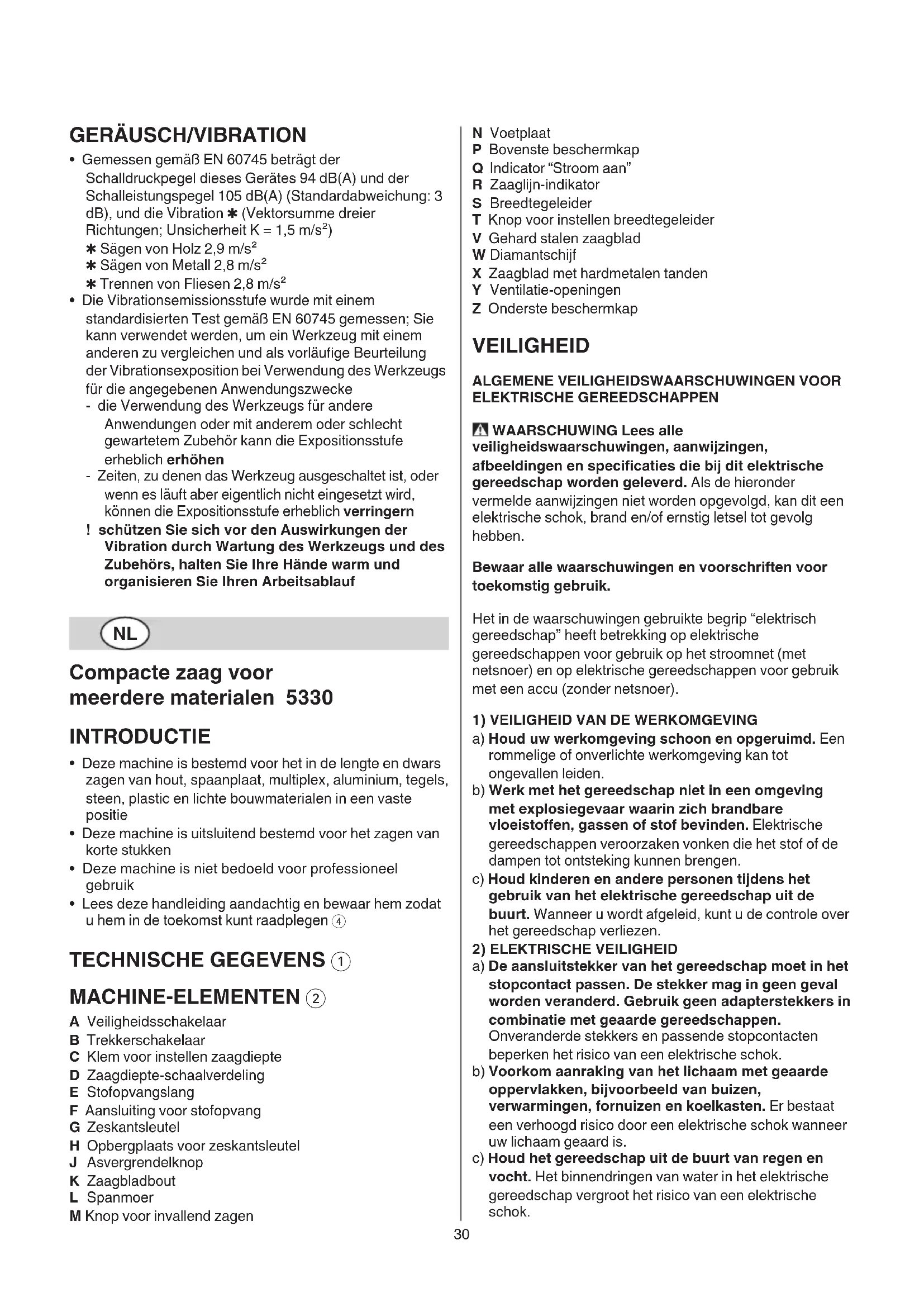 - Lees deze handleiding aandachtig en bewaar hem zodat u hem in de toekomst kunt raadplegen 4 TECHNISCHE GEGEVENS 1 MACHINE-ELEMENTEN 2 A Veiligheidsschakelaar B Trekkerschakelaar C Klem voor instellen zaagdiepte D Zaagdiepte-schaalverdeling E Stofopvangslang F Aansluiting voor stofopvang G Zeskantsleutel H Opbergplaats voor zeskantsleutel J Asvergrendelknop K Zaagbladbout L Spanmoer M Knop voor invallend zagen N Voetplaat P Bovenste beschermkap Q Indicator “Stroom aan” R Zaaglijn-indikator S Breedtegeleider T Knop voor instellen breedtegeleider V Gehard stalen zaagblad W Diamantschijf X Zaagblad met hardmetalen tanden Y Ventilatie-openingen Z Onderste beschermkap VEILIGHEID