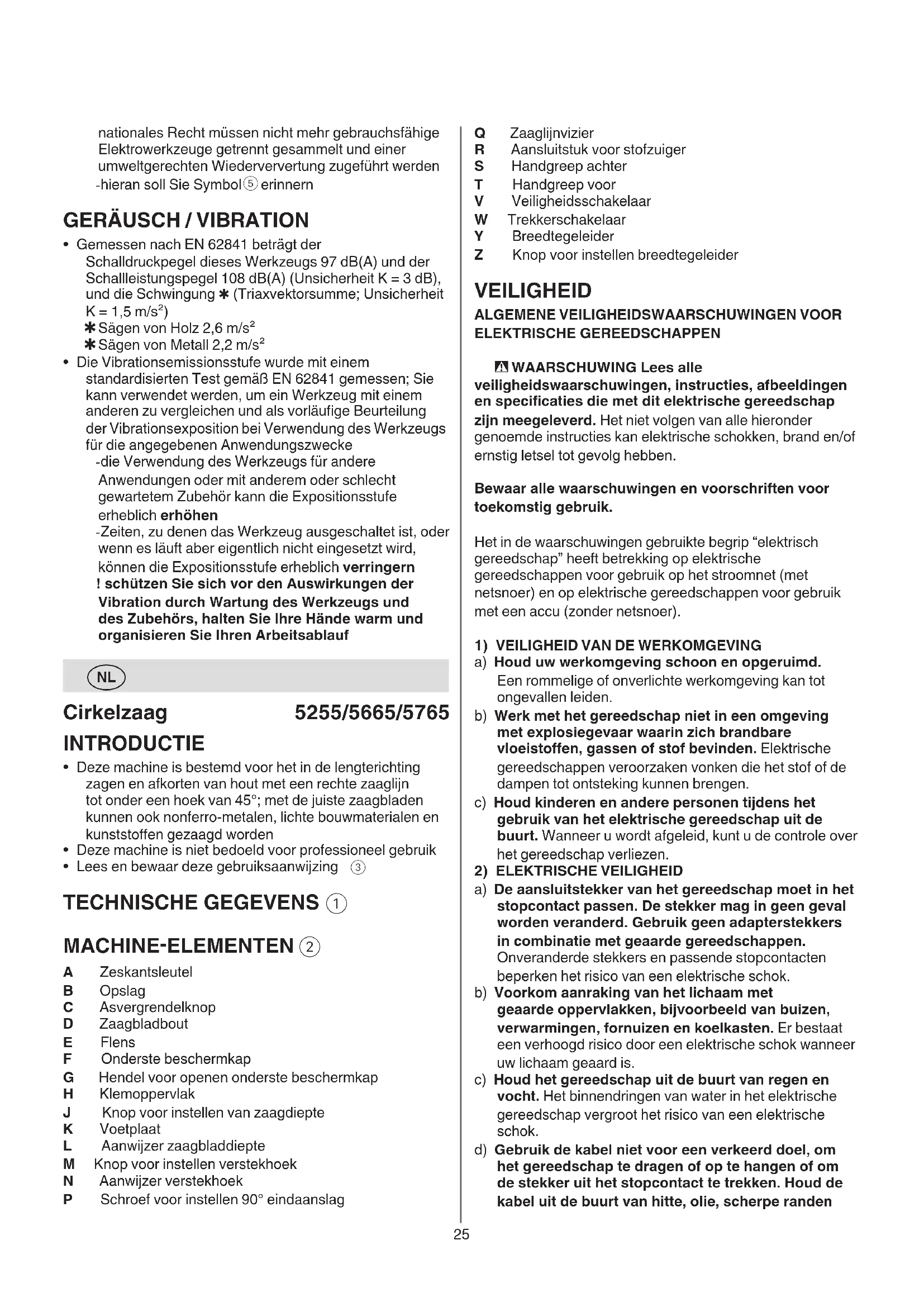 a) Wees alert, let goed op wat u doet en ga met verstand te werk bij het gebruik van het elektrische gereedschap. Gebruik het gereedschap niet wanneer u moe bent of onder invloed staat van drugs, alcohol of medicijnen. Een moment van onoplettendheid bij het gebruik van het gereedschap kan tot ernstige verwondingen leiden. b) Draag persoonlijke beschermende uitrusting en altijd een veiligheidsbril. Het dragen van persoonlijke beschermende uitrusting zoals een stofmasker, slipvaste werkschoenen, een veiligheidshelm of gehoorbescherming, afhankelijk van de aard en het gebruik van het elektrische gereedschap, vermindert het risico van verwondingen. c) Voorkom per ongeluk inschakelen. Controleer dat het elektrische gereedschap uitgeschakeld is voordat u de stekker in het stopcontact steekt of de accu aansluit en voordat u het gereedschap oppakt of draagt. Wanneer u bij het dragen van het elektrische gereedschap uw vinger aan de schakelaar hebt of wanneer u het gereedschap ingeschakeld op de stroomvoorziening aansluit, kan dit tot ongevallen leiden. d) Verwijder instelgereedschappen of schroefsleutels voordat u het gereedschap inschakelt. Een instelgereedschap of sleutel in een draaiend deel van het gereedschap kan tot verwondingen leiden. e) Probeer niet ver te reiken. Zorg ervoor dat u stevig staat en steeds in evenwicht blijft. Daardoor kunt u het gereedschap in onverwachte situaties beter onder controle houden. f) Draag geschikte kleding. Draag geen loshangende kleding of sieraden. Houd haren en kleding uit de buurt van bewegende delen. Loshangende kleding, sieraden en lange haren kunnen door bewegende delen worden meegenomen. g) Wanneer stofafzuigings- of stofopvang- voorzieningen kunnen worden gemonteerd, dient u zich ervan te verzekeren dat deze zijn aangesloten en juist worden gebruikt. Het gebruik van een stofafzuiging beperkt het gevaar door stof. h) Ondanks het feit dat u eventueel heel goed vertrouwd bent met het gebruik van gereedschappen, moet u ervoor zorgen dat u niet nonchalant wordt en veiligheidsvoorschriften voor het gereedschap gaat negeren. Een onoplettende handeling kan binnen een fractie van een seconde ernstig letsel veroorzaken.27 voorzorgsmaatregelen in acht genomen worden. b) Laat de schakelaar los, indien het zaagblad vastloopt, of indien om een andere reden het zaagproces onderbroken wordt, en houd de machine bewegingsloos in het materiaal totdat het zaagblad volkomen tot stilstand komt. Probeer nooit om de zaag uit het werkstuk te verwijderen, of trek de zaag nooit naar achteren als het zaagblad in beweging is, want anders ontstaat terugslag. Onderzoek en neem corrigerende maatregelen om de oorzaak van vastlopen van het zaagblad te elimineren. Vermijd het zagen in spijkers en schroeven. c) Plaats, bij het opnieuw starten van de machine als deze zich in het werkstuk bevindt, het zaagblad midden in de zaagsnede en controleer of de zaagtanden niet in het materiaal vastzitten. Als het zaagblad vastloopt, kan het uit het werkstuk lopen of een terugslag-reactie geven als de machine opnieuw wordt gestart. d) Ondersteun grote panelen om het risico van vastklemmen en terugslaan van het zaagblad tot een minimum te beperken. Grote panelen hebben de neiging onder hun eigen gewicht door te zakken. De steunpunten moeten aan beide kanten onder het paneel geplaatst worden, vlakbij de zaagsnede en vlakbij de zijkant van het paneel. e) Gebruik geen botte of beschadigde zaagbladen. Een onscherp of onjuist geplaatst zaagblad zorgt voor een smalle zaagsnede met grote wrijving, vastlopen van het zaagblad en machine-terugslag als gevolg. f) De bedieningshendels voor het instellen van zaagdiepte en verstekhoek moeten stevig vastzitten, voordat u gaat zagen. Als de zaagblad-instelling verschuift tijdens het zagen, kan dit vastlopen van het zaagblad en machine-terugslag tot gevolg hebben. g) Wees bijzonder voorzichtig bij zaagwerkzaamheden in bestaande muren of andere plaatsen zonder voldoende zicht. Het invallende zaagblad kan bij zaagwerkzaamheden in niet-zichtbare voorwerpen blokkeren en een terugslag veroorzaken.