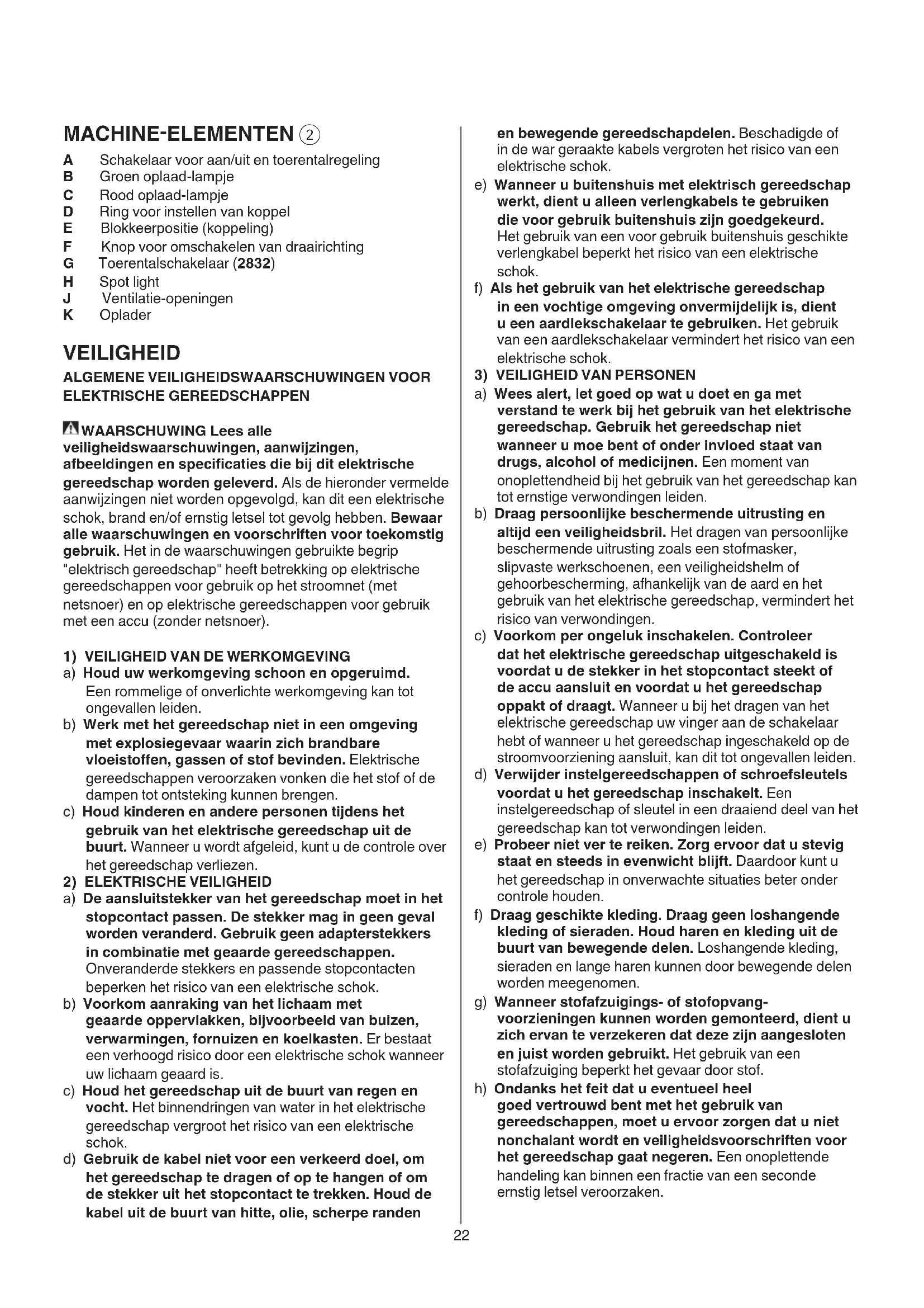 A Schakelaar voor aan/uit en toerentalregeling B Groen oplaad-lampje C Rood oplaad-lampje D Ring voor instellen van koppel E Blokkeerpositie (koppeling) F Knop voor omschakelen van draairichting G Toerentalschakelaar (2832) H Spot light J Ventilatie-openingen K Oplader VEILIGHEID