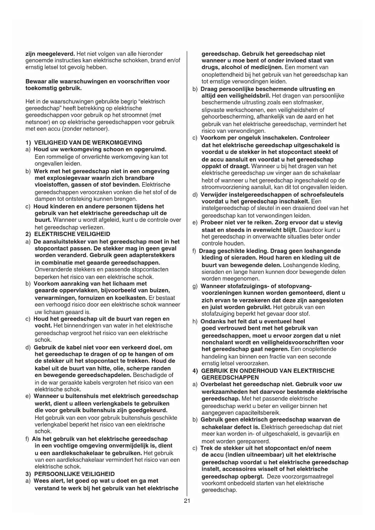 GEREEDSCHAPPEN a) Overbelast het gereedschap niet. Gebruik voor uw werkzaamheden het daarvoor bestemde elektrische gereedschap. Met het passende elektrische gereedschap werkt u beter en veiliger binnen het aangegeven capaciteitsbereik. b) Gebruik geen elektrisch gereedschap waarvan de schakelaar defect is. Elektrisch gereedschap dat niet meer kan worden in- of uitgeschakeld, is gevaarlijk en moet worden gerepareerd. c) Trek de stekker uit het stopcontact en/of neem de accu (indien uitneembaar) uit het elektrische gereedschap voordat u het elektrische gereedschap instelt, accessoires wisselt of het elektrische gereedschap opbergt. Deze voorzorgsmaatregel voorkomt onbedoeld starten van het elektrische gereedschap. zijn meegeleverd. Het niet volgen van alle hieronder genoemde instructies kan elektrische schokken, brand en/of ernstig letsel tot gevolg hebben. Bewaar alle waarschuwingen en voorschriften voor toekomstig gebruik. Het in de waarschuwingen gebruikte begrip “elektrisch gereedschap” heeft betrekking op elektrische gereedschappen voor gebruik op het stroomnet (met netsnoer) en op elektrische gereedschappen voor gebruik met een accu (zonder netsnoer).