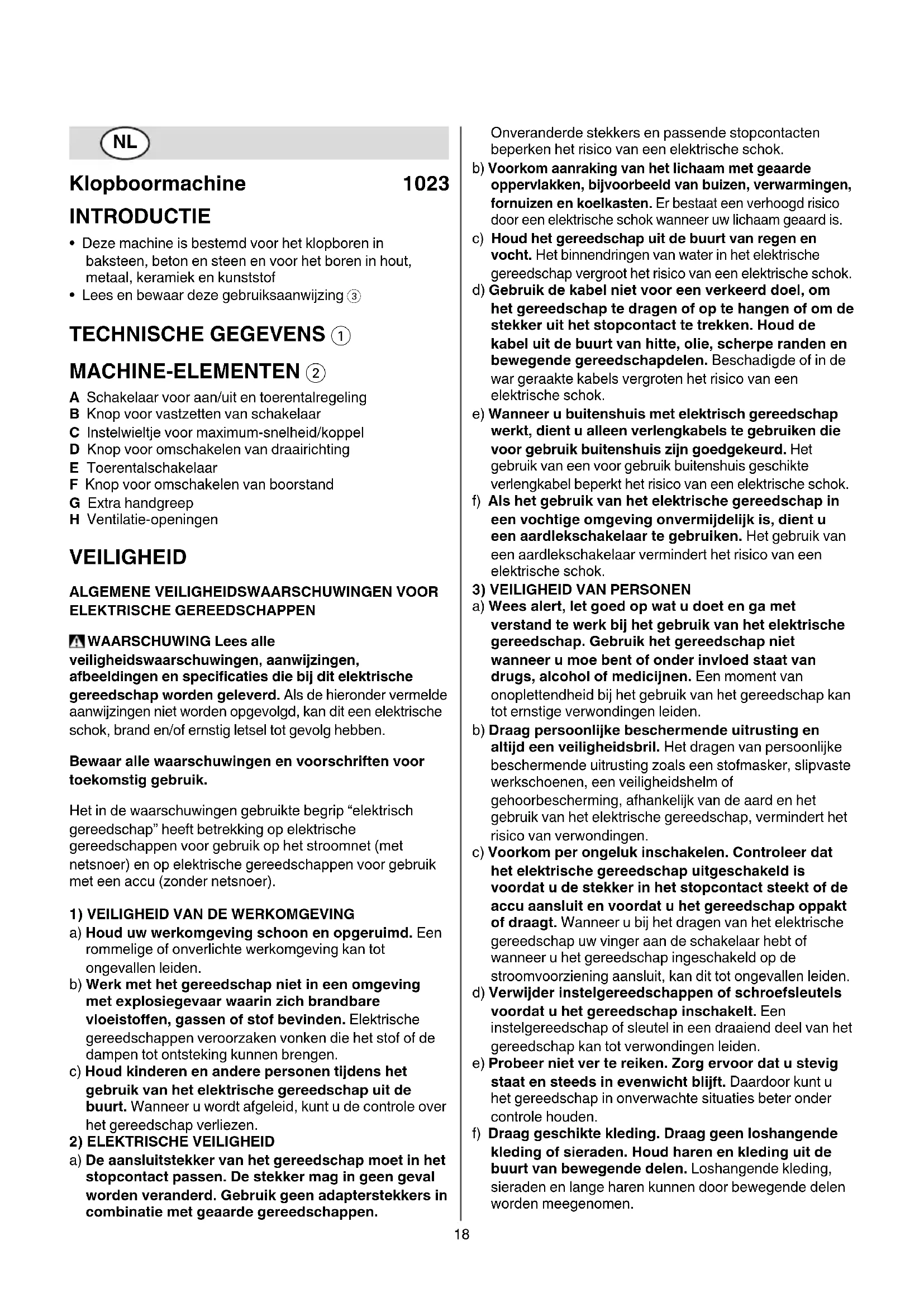 - Lees en bewaar deze gebruiksaanwijzing 3 TECHNISCHE GEGEVENS 1 MACHINE-ELEMENTEN 2 A Schakelaar voor aan/uit en toerentalregeling B Knop voor vastzetten van schakelaar C Instelwieltje voor maximum-snelheid/koppel D Knop voor omschakelen van draairichting E Toerentalschakelaar F Knop voor omschakelen van boorstand G Extra handgreep H Ventilatie-openingen VEILIGHEID