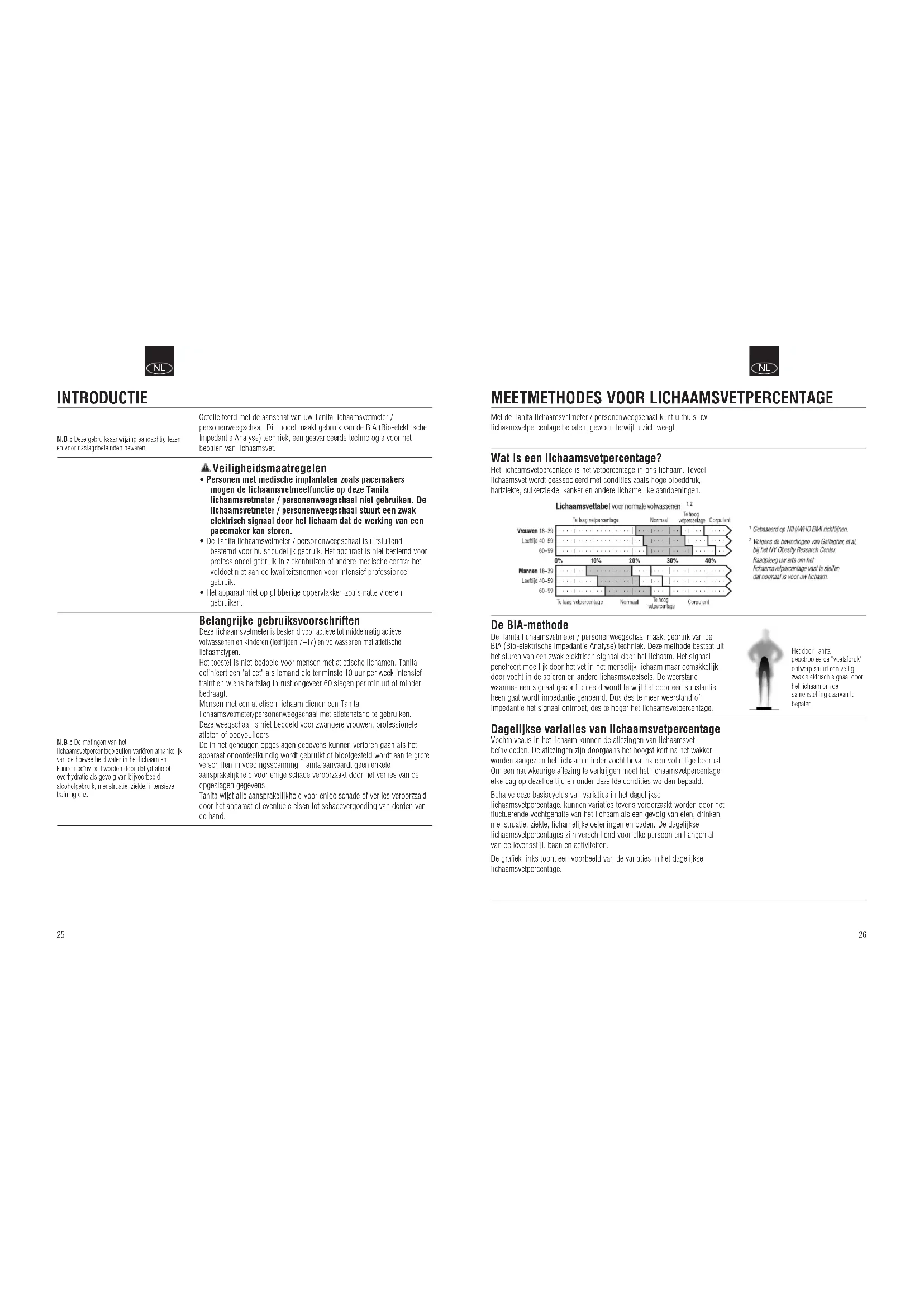 - Het apparaat niet op glibberige oppervlakken zoals natte vloeren gebruiken. Belangrijke gebruiksvoorschriften Deze lichaamsvetmeter is bestemd voor actieve tot middelmatig actieve volwassenen en kinderen (leeftijden 7–17) en volwassenen met atletische lichaamstypen. Het toestel is niet bedoeld voor mensen met atletische lichamen. Tanita definieert een "atleet" als iemand die tenminste 10 uur per week intensief traint en wiens hartslag in rust ongeveer 60 slagen per minuut of minder bedraagt. Mensen met een atletisch lichaam dienen een Tanita lichaamsvetmeter/personenweegschaal met atletenstand te gebruiken. Deze weegschaal is niet bedoeld voor zwangere vrouwen, professionele atleten of bodybuilders. De in het geheugen opgeslagen gegevens kunnen verloren gaan als het apparaat onoordeelkundig wordt gebruikt of blootgesteld wordt aan te grote verschillen in voedingsspanning. Tanita aanvaardt geen enkele aansprakelijkheid voor enige schade veroorzaakt door het verlies van de opgeslagen gegevens. Tanita wijst alle aansprakelijkheid voor enige schade of verlies veroorzaakt door het apparaat of eventuele eisen tot schadevergoeding van derden van de hand. N.B.: Deze gebruiksaanwijzing aandachtig lezenen voor naslagdoeleinden bewaren.N.B.: De metingen van hetlichaamsvetpercentage zullen variëren afhankelijkvan de hoeveelheid water in het lichaam enkunnen beïnvloed worden door dehydratie ofoverhydratie als gevolg van bijvoorbeeldalcoholgebruik, menstruatie, ziekte, intensievetraining enz. UM060/取説 06.1.28 4:22 PM ページ29NL