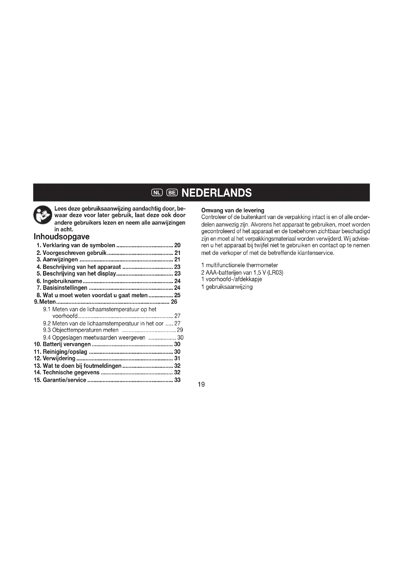 Tél.: 0800 706 11 service-be@sanitas-online.de Nous vous invitons à nous renvoyer le produit défectueux à l’adresse suivante : NU Service GmbH Lessingstraße 10 b 89231 Neu-Ulm Germany1819 Omvang van de levering Controleer of de buitenkant van de verpakking intact is en of alle onder- delen aanwezig zijn. Alvorens het apparaat te gebruiken, moet worden gecontroleerd of het apparaat en de toebehoren zichtbaar beschadigd zijn en moet al het verpakkingsmateriaal worden verwijderd. Wij advise- ren u het apparaat bij twijfel niet te gebruiken en contact op te nemen met de verkoper of met de betreende klantenservice. 1 multifunctionele thermometer 2 AAA-batterijen van 1,5 V (LR03) 1 voorhoofd-/afdekkapje 1 gebruiksaanwijzing Inhoudsopgave O ) NEDERLANDS Lees deze gebruiksaanwijzing aandachtig door, be- waar deze voor later gebruik, laat deze ook door andere gebruikers lezen en neem alle aanwijzingen in acht.