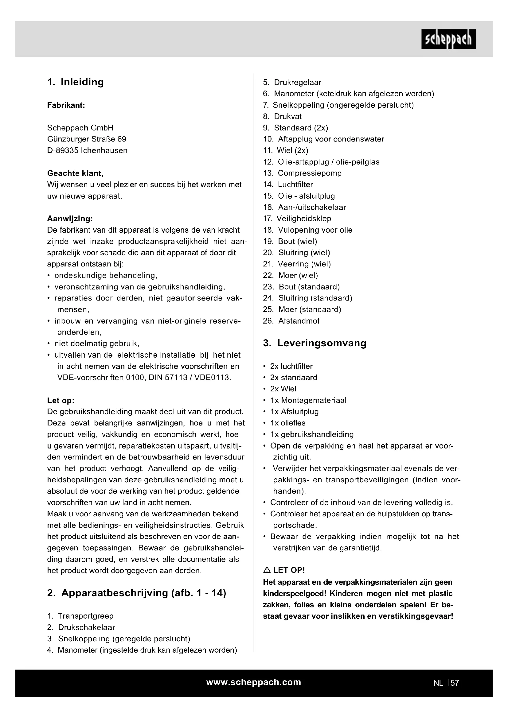 Fabrikant: Scheppach GmbH Günzburger Straße 69 D-89335 Ichenhausen Geachte klant, Wij wensen u veel plezier en succes bij het werken met uw nieuwe apparaat. Aanwijzing: De fabrikant van dit apparaat is volgens de van kracht zijnde wet inzake productaansprakelijkheid niet aan- sprakelijk voor schade die aan dit apparaat of door dit apparaat ontstaan bij:
