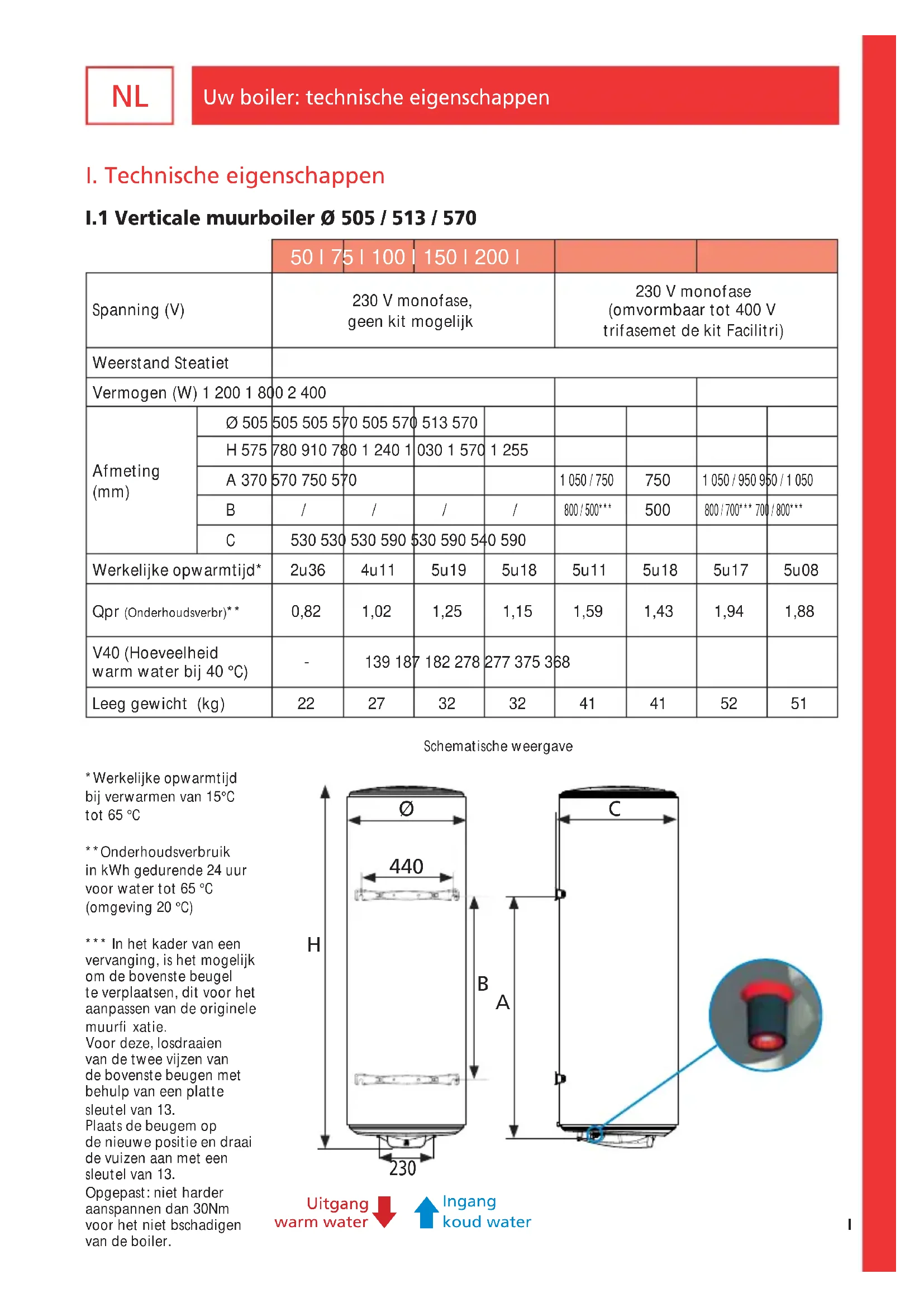I.1 Verticale muurboiler Ø 505 / 513 / 570 *Werkelijke opwarmtijd bij verwarmen van 15°C tot 65 °C**Onderhoudsverbruik in kWh gedurende 24 uur voor water tot 65 °C (omgeving 20 °C)*** In het kader van een vervanging, is het mogelijk om de bovenste beugel te verplaatsen, dit voor het aanpassen van de originele muurfi xatie.Voor deze, losdraaien van de twee vijzen van de bovenste beugen met behulp van een platte sleutel van 13.Plaats de beugem op de nieuwe positie en draai de vuizen aan met een sleutel van 13.Opgepast: niet harder aanspannen dan 30Nm voor het niet bschadigen van de boiler.Schematische weergave Uw boiler: technische eigenschappen Uitgang warm water Ingang koud water