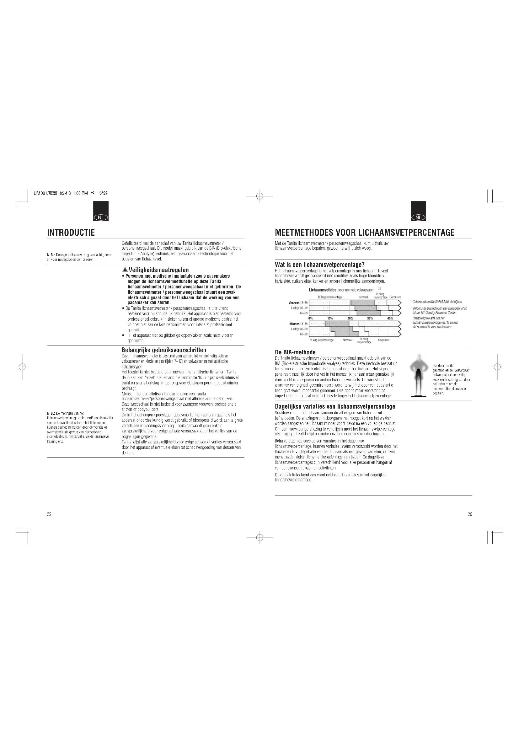 - Het apparaat niet op glibberige oppervlakken zoals natte vloeren gebruiken. Belangrijke gebruiksvoorschriften Deze lichaamsvetmeter is bestemd voor actieve tot middelmatig actieve volwassenen en kinderen (leeftijden 7–17) en volwassenen met atletische lichaamstypen. Het toestel is niet bedoeld voor mensen met atletische lichamen. Tanita definieert een "atleet" als iemand die tenminste 10 uur per week intensief traint en wiens hartslag in rust ongeveer 60 slagen per minuut of minder bedraagt. Mensen met een atletisch lichaam dienen een Tanita lichaamsvetmeter/personenweegschaal met atletenstand te gebruiken. Deze weegschaal is niet bedoeld voor zwangere vrouwen, professionele atleten of bodybuilders. De in het geheugen opgeslagen gegevens kunnen verloren gaan als het apparaat onoordeelkundig wordt gebruikt of blootgesteld wordt aan te grote verschillen in voedingsspanning. Tanita aanvaardt geen enkele aansprakelijkheid voor enige schade veroorzaakt door het verlies van de opgeslagen gegevens. Tanita wijst alle aansprakelijkheid voor enige schade of verlies veroorzaakt door het apparaat of eventuele eisen tot schadevergoeding van derden van de hand. N.B.: Deze gebruiksaanwijzing aandachtig lezenen voor naslagdoeleinden bewaren.N.B.: De metingen van hetlichaamsvetpercentage zullen variëren afhankelijkvan de hoeveelheid water in het lichaam enkunnen beïnvloed worden door dehydratie ofoverhydratie als gevolg van bijvoorbeeldalcoholgebruik, menstruatie, ziekte, intensievetraining enz. UM081/取説05.4.81:00PMページ29NL
