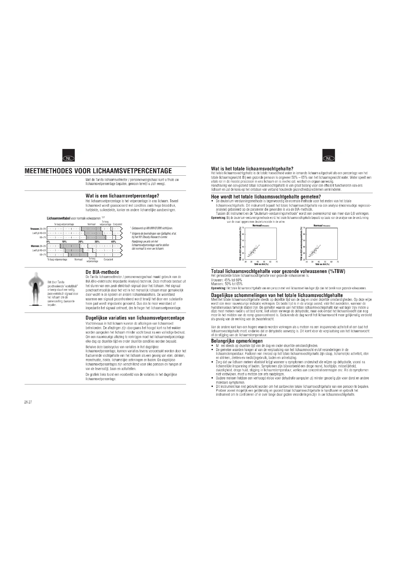 - De deuterium-verdunningsmethode is tegenwoordig de normale methode voor het meten van het totale lichaamsvochtgehalte. Dit instrument bepaalt het totale lichaamsvochtgehalte via een analyse (meervoudige regressie- analyse) gebaseerd op de parameter die gevonden is via de BIA-methode. Tussen dit instrument en de "deuterium-verdunningsmethode" wordt een overeenkomst van meer dan 0,8 verkregen. Opmerking: Bij de deuterium-verdunningsmethode wordt het totale lichaamsvochtgehalte bepaald op basis van de analyse van de verdunning van de oraal opgenomen deuteriumoxide in de urine. Totaal lichaamsvochtgehalte voor gezonde volwassenen (%TBW) Het gemiddelde totale lichaamsvochtgehalte voor gezonde volwassenen is: Vrouwen: 45% tot 60% Mannen: 50% tot 65% Opmerking: Het totale lichaamsvochtgehalte van een persoon met veel lichaamsvet kan lager zijn dan het bereik voor gezonde volwassenen. Dagelijkse schommelingen van het totale lichaamsvochtgehalte Meet het totale lichaamsvochtgehalte steeds op dezelfde tijd van de dag en onder dezelfde omstandigheden. Op deze wijze wordt een meer nauwkeurige indicatie verkregen. De beste tijd is in de vroege avond, vóór het avondeten, wanneer de hydratieniveaus tamelijk stabiel zijn. De gemeten waarde van het totale lichaamsvochtgehalte kan wat lager zijn indien u deze meet meteen nadat u uit bed komt, niet alleen vanwege de dehydratie, maar ook omdat het lichaamsvocht dan nog meer in het midden van de romp geconcentreerd is. Gedurende de dag wordt het lichaamsvocht meer gelijkmatig verdeeld als gevolg van de werking van de zwaartekracht. Van de andere kant kan een hogere waarde worden verkregen als u meteen na een inspannende activiteit of een bad het lichaamsvochtgehalte meet, ondanks dat er dehydratie aanwezig is. Dit komt door de verplaatsing van het lichaamsvocht of de stijging van de lichaamstemperatuur. Belangrijke opmerkingen