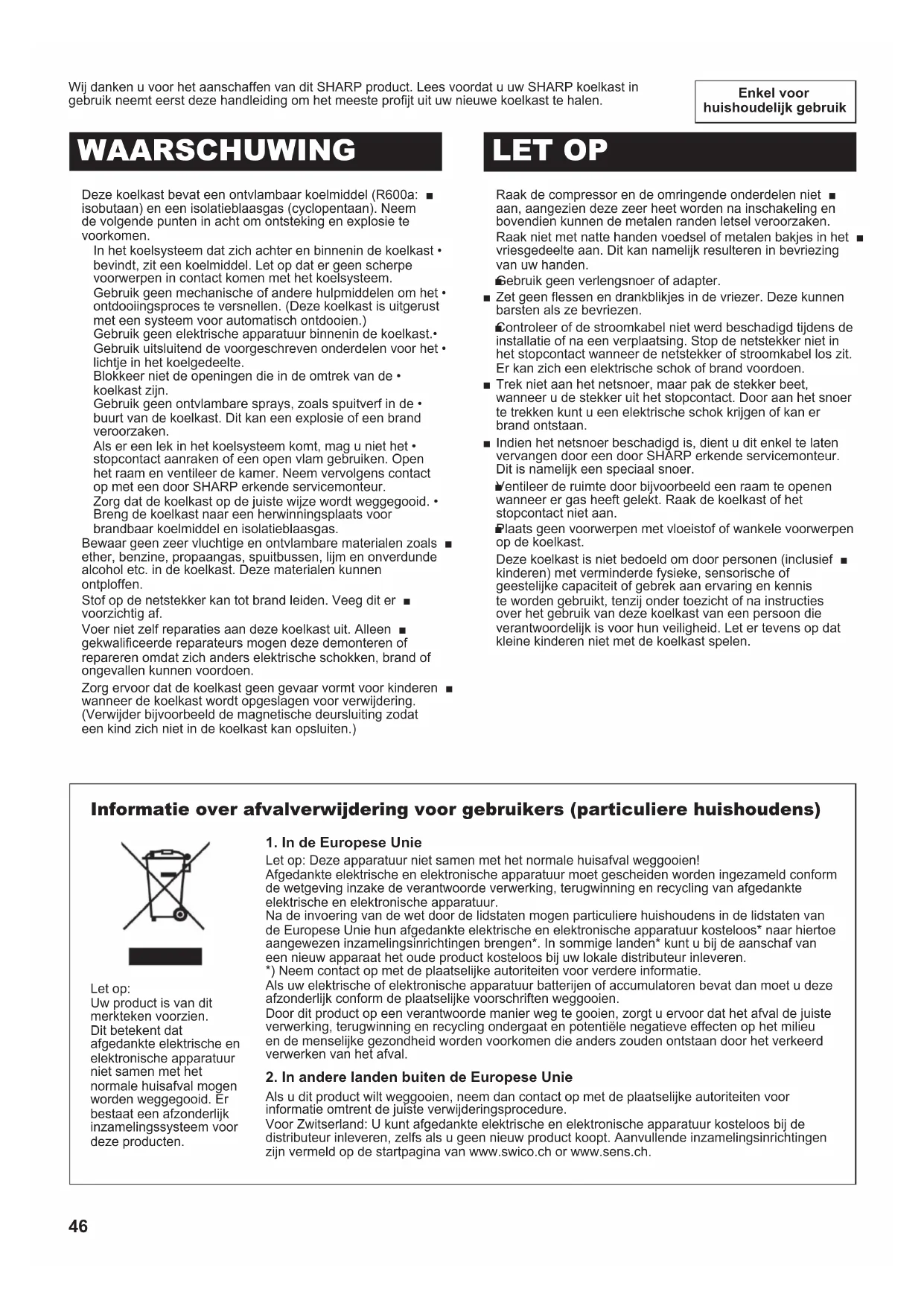 (B246)-W.indb 45 2011/08/30 22:05:5046 Enkel voor huishoudelijk gebruik Wij danken u voor het aanschaffen van dit SHARP product. Lees voordat u uw SHARP koelkast in gebruik neemt eerst deze handleiding om het meeste projt uit uw nieuwe koelkast te halen. Deze koelkast bevat een ontvlambaar koelmiddel (R600a: ■ isobutaan) en een isolatieblaasgas (cyclopentaan). Neem de volgende punten in acht om ontsteking en explosie te voorkomen. In het koelsysteem dat zich achter en binnenin de koelkast • bevindt, zit een koelmiddel. Let op dat er geen scherpe voorwerpen in contact komen met het koelsysteem. Gebruik geen mechanische of andere hulpmiddelen om het • ontdooiingsproces te versnellen. (Deze koelkast is uitgerust met een systeem voor automatisch ontdooien.) Gebruik geen elektrische apparatuur binnenin de koelkast.• Gebruik uitsluitend de voorgeschreven onderdelen voor het • lichtje in het koelgedeelte. Blokkeer niet de openingen die in de omtrek van de • koelkast zijn. Gebruik geen ontvlambare sprays, zoals spuitverf in de • buurt van de koelkast. Dit kan een explosie of een brand veroorzaken. Als er een lek in het koelsysteem komt, mag u niet het • stopcontact aanraken of een open vlam gebruiken. Open het raam en ventileer de kamer. Neem vervolgens contact op met een door SHARP erkende servicemonteur. Zorg dat de koelkast op de juiste wijze wordt weggegooid. • Breng de koelkast naar een herwinningsplaats voor brandbaar koelmiddel en isolatieblaasgas. Bewaar geen zeer vluchtige en ontvlambare materialen zoals ■ ether, benzine, propaangas, spuitbussen, lijm en onverdunde alcohol etc. in de koelkast. Deze materialen kunnen ontploffen. Stof op de netstekker kan tot brand leiden. Veeg dit er ■ voorzichtig af. Voer niet zelf reparaties aan deze koelkast uit. Alleen ■ gekwaliceerde reparateurs mogen deze demonteren of repareren omdat zich anders elektrische schokken, brand of ongevallen kunnen voordoen. Zorg ervoor dat de koelkast geen gevaar vormt voor kinderen ■ wanneer de koelkast wordt opgeslagen voor verwijdering. (Verwijder bijvoorbeeld de magnetische deursluiting zodat een kind zich niet in de koelkast kan opsluiten.) WAARSCHUWING LET OP Raak de compressor en de omringende onderdelen niet ■ aan, aangezien deze zeer heet worden na inschakeling en bovendien kunnen de metalen randen letsel veroorzaken. Raak niet met natte handen voedsel of metalen bakjes in het ■ vriesgedeelte aan. Dit kan namelijk resulteren in bevriezing van uw handen. Gebruik geen verlengsnoer of adapter. ■ Zet geen essen en drankblikjes in de vriezer. Deze kunnen ■ barsten als ze bevriezen. Controleer of de stroomkabel niet werd beschadigd tijdens de ■ installatie of na een verplaatsing. Stop de netstekker niet in het stopcontact wanneer de netstekker of stroomkabel los zit. Er kan zich een elektrische schok of brand voordoen. Trek niet aan het netsnoer, maar pak de stekker beet, ■ wanneer u de stekker uit het stopcontact. Door aan het snoer te trekken kunt u een elektrische schok krijgen of kan er brand ontstaan. Indien het netsnoer beschadigd is, dient u dit enkel te laten ■ vervangen door een door SHARP erkende servicemonteur. Dit is namelijk een speciaal snoer. Ventileer de ruimte door bijvoorbeeld een raam te openen ■ wanneer er gas heeft gelekt. Raak de koelkast of het stopcontact niet aan. Plaats geen voorwerpen met vloeistof of wankele voorwerpen ■ op de koelkast. Deze koelkast is niet bedoeld om door personen (inclusief ■ kinderen) met verminderde fysieke, sensorische of geestelijke capaciteit of gebrek aan ervaring en kennis te worden gebruikt, tenzij onder toezicht of na instructies over het gebruik van deze koelkast van een persoon die verantwoordelijk is voor hun veiligheid. Let er tevens op dat kleine kinderen niet met de koelkast spelen. Informatie over afvalverwijdering voor gebruikers (particuliere huishoudens)