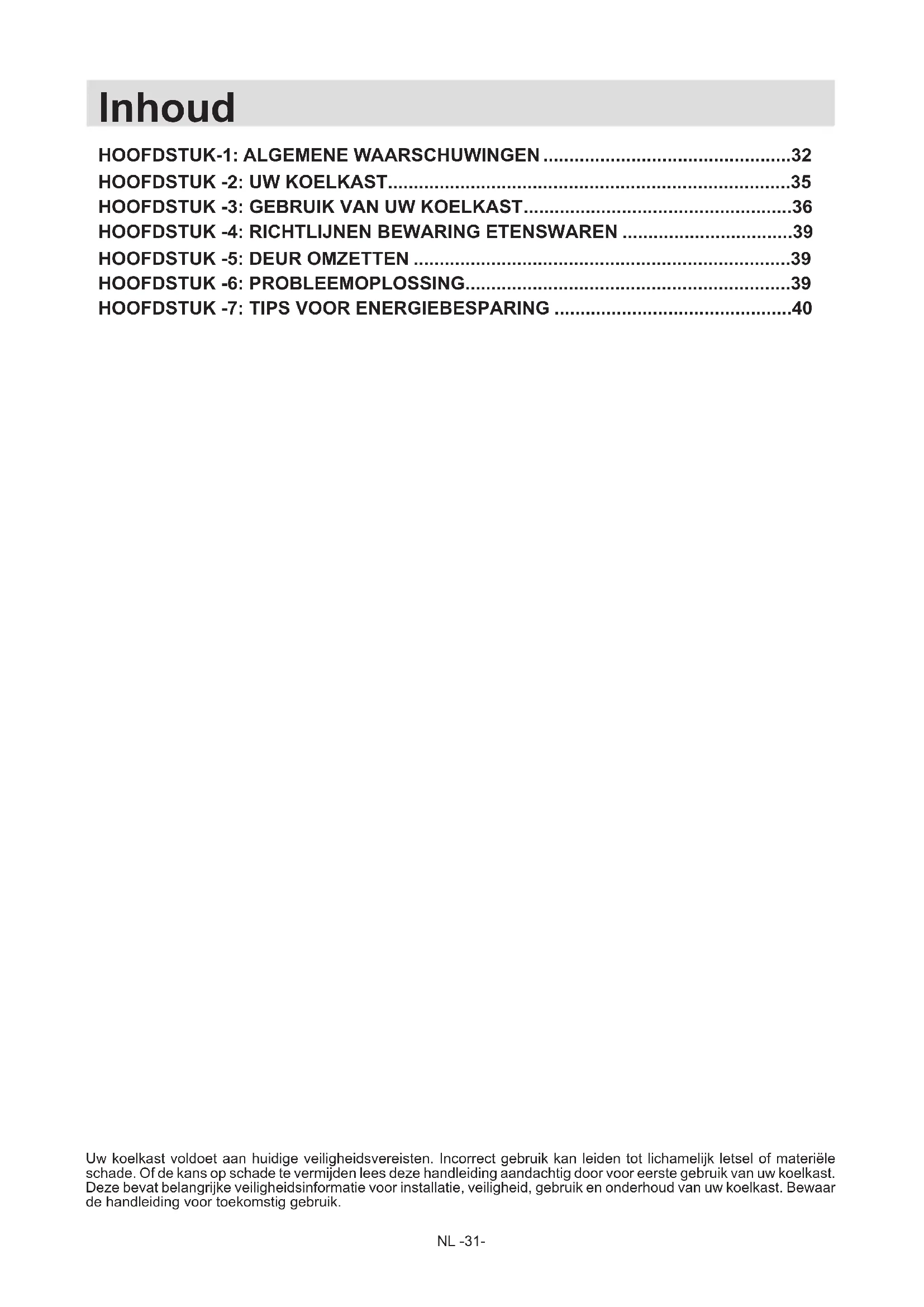 Si vous avez besoin d’assistance, contactez la HOTLINE CONSOMMATEUR ou le service après-vente pour des informations complémentaires au numéro suivant : HOTLINE CONSOMMATEUR Ouvert de lundi au vendredi de 9h00 à 18h30 Et le samedi de 9h00 à 17h30NL -31- Uw koelkast voldoet aan huidige veiligheidsvereisten. Incorrect gebruik kan leiden tot lichamelijk letsel of materiële schade. Of de kans op schade te vermijden lees deze handleiding aandachtig door voor eerste gebruik van uw koelkast. Deze bevat belangrijke veiligheidsinformatie voor installatie, veiligheid, gebruik en onderhoud van uw koelkast. Bewaar de handleiding voor toekomstig gebruik. Inhoud