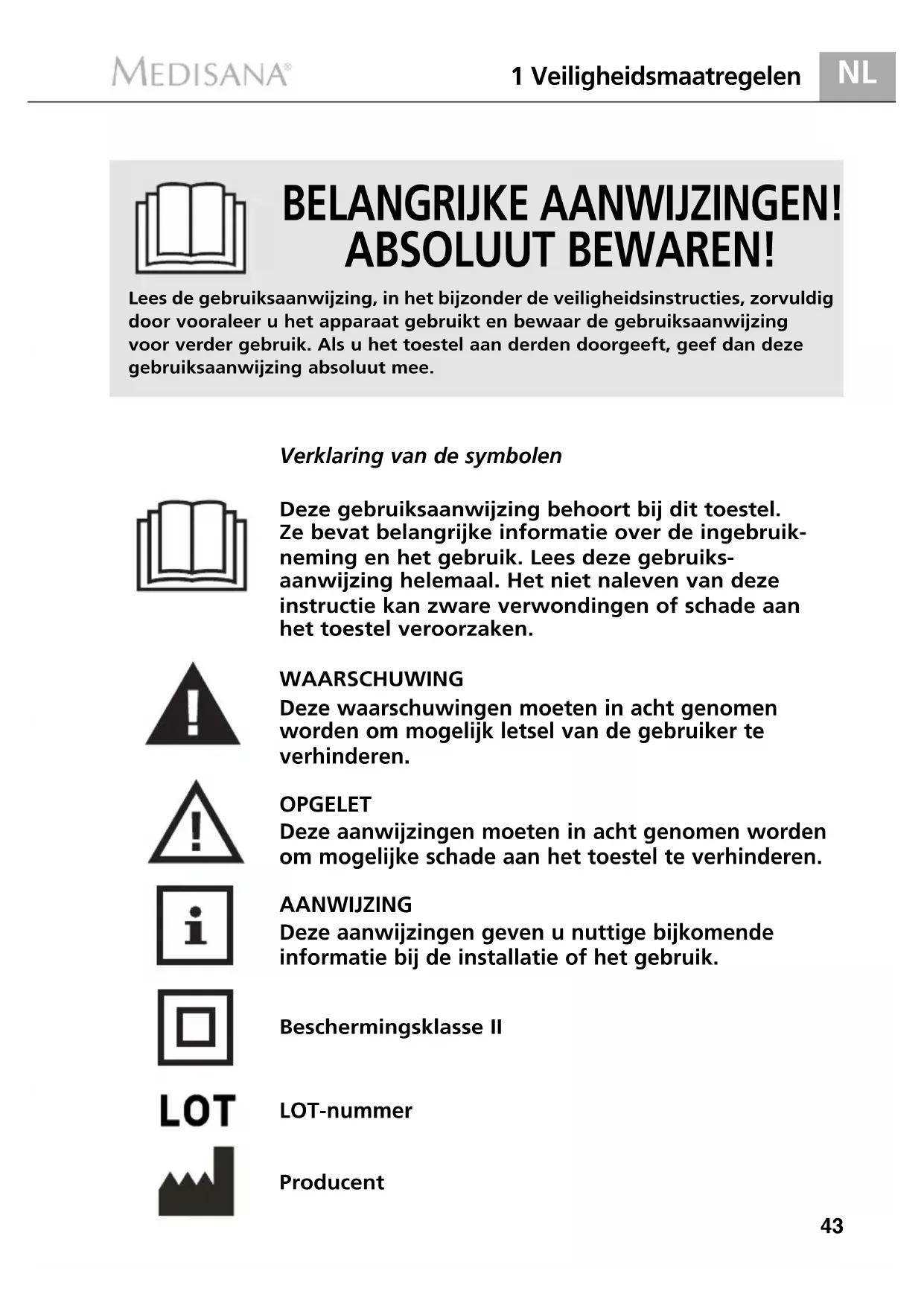 BELANGRIJKE AANWIJZINGEN! ABSOLUUT BEWAREN! Deze gebruiksaanwijzing behoort bij dit toestel. Ze bevat belangrijke informatie over de ingebruik-neming en het gebruik. Lees deze gebruiks-aanwijzing helemaal. Het niet naleven van dezeinstructie kan zware verwondingen of schade aan het toestel veroorzaken.WAARSCHUWING Deze waarschuwingen moeten in acht genomen worden om mogelijk letsel van de gebruiker te verhinderen. OPGELET Deze aanwijzingen moeten in acht genomen worden om mogelijke schade aan het toestel te verhinderen. AANWIJZING Deze aanwijzingen geven u nuttige bijkomende informatie bij de installatie of het gebruik. Beschermingsklasse II LOT-nummer ProducentLees de gebruiksaanwijzing, in het bijzonder de veiligheidsinstructies, zorvuldigdoor vooraleer u het apparaat gebruikt en bewaar de gebruiksaanwijzing voor verder gebruik. Als u het toestel aan derden doorgeeft, geef dan dezegebruiksaanwijzing absoluut mee. Verklaring van de symbolen 61200_GA_HU_660_West_03.08.qxd:Wärmeunterbett 03.08.2012 11:50 Uhr Seite 4344 1 Veiligheidsmaatregelen