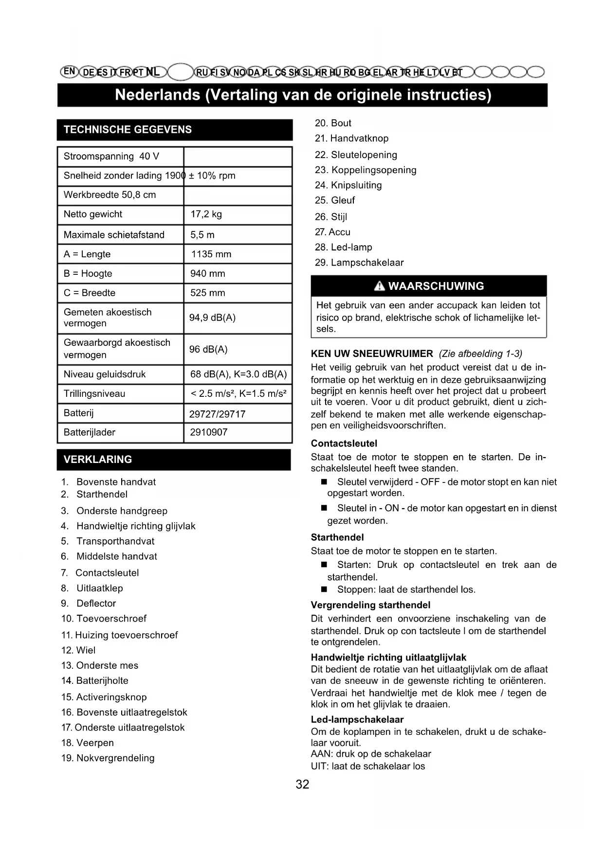 DE ES IT FR PT NLRU FI SV NO DA PL CS SK SL HR HU RO BG EL AR TR HE LT LV ET20. Bout21. Handvatknop22. Sleutelopening23. Koppelingsopening24. Knipsluiting25. Gleuf26. Stijl27. Accu28. Led-lamp29. Lampschakelaar WAARSCHUWING Het gebruik van een ander accupack kan leiden tot risico op brand, elektrische schok of lichamelijke let-sels.KEN UW SNEEUWRUIMER (Zie afbeelding 1-3) Het veilig gebruik van het product vereist dat u de in-formatie op het werktuig en in deze gebruiksaanwijzing begrijpt en kennis heeft over het project dat u probeert uit te voeren. Voor u dit product gebruikt, dient u zich-zelf bekend te maken met alle werkende eigenschap-pen en veiligheidsvoorschriften.ContactsleutelStaat toe de motor te stoppen en te starten. De in-schakelsleutel heeft twee standen. Sleutel verwijderd - OFF - de motor stopt en kan niet opgestart worden. Sleutel in - ON - de motor kan opgestart en in dienst gezet worden.StarthendelStaat toe de motor te stoppen en te starten. Starten: Druk op contactsleutel en trek aan de starthendel. Stoppen: laat de starthendel los.Vergrendeling starthendelDit verhindert een onvoorziene inschakeling van de starthendel. Druk op con tactsleute l om de starthendel te ontgrendelen.Handwieltje richting uitlaatglijvlakDit bedient de rotatie van het uitlaatglijvlak om de aaat van de sneeuw in de gewenste richting te oriënteren. Verdraai het handwieltje met de klok mee / tegen de klok in om het glijvlak te draaien.Led-lampschakelaar Om de koplampen in te schakelen, drukt u de schake-laar vooruit.AAN: druk op de schakelaar UIT: laat de schakelaar los TECHNISCHE GEGEVENS Stroomspanning 40 VSnelheid zonder lading 1900 ± 10% rpmWerkbreedte 50,8 cmNetto gewicht 17,2 kgMaximale schietafstand 5,5 mA = Lengte 1135 mmB = Hoogte 940 mmC = Breedte 525 mmGemeten akoestisch vermogen94,9 dB(A)Gewaarborgd akoestisch vermogen96 dB(A)Niveau geluidsdruk 68 dB(A), K=3.0 dB(A)Trillingsniveau ﹤ 2.5 m/s², K=1.5 m/s²Batterij29727/29717Batterijlader 2910907 VERKLARING 1. Bovenste handvat2. Starthendel3. Onderste handgreep4. Handwieltje richting glijvlak5. Transporthandvat6. Middelste handvat 7. Contactsleutel8. Uitlaatklep9. Deector10. Toevoerschroef11. Huizing toevoerschroef12. Wiel13. Onderste mes14. Batterijholte15. Activeringsknop16. Bovenste uitlaatregelstok 17. Onderste uitlaatregelstok 18. Veerpen19. Nokvergrendeling 32Nederlands (Vertaling van de originele instructies)
