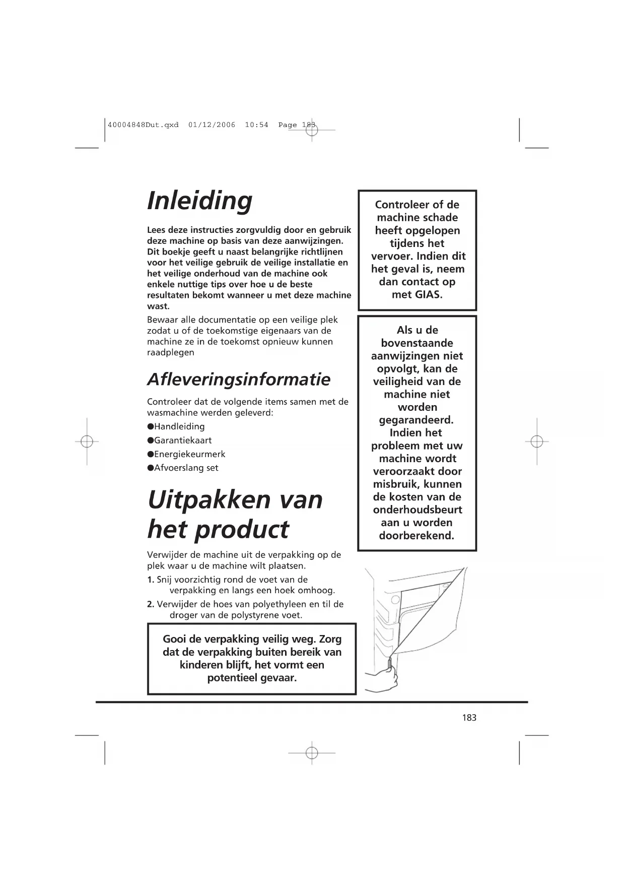 40004848Dut.qxd 01/12/2006 10:53 Page 182Inleiding Lees deze instructies zorgvuldig door en gebruik deze machine op basis van deze aanwijzingen. Dit boekje geeft u naast belangrijke richtlijnen voor het veilige gebruik de veilige installatie en het veilige onderhoud van de machine ook enkele nuttige tips over hoe u de beste resultaten bekomt wanneer u met deze machine wast. Bewaar alle documentatie op een veilige plek zodat u of de toekomstige eigenaars van de machine ze in de toekomst opnieuw kunnen raadplegen Afleveringsinformatie Controleer dat de volgende items samen met de wasmachine werden geleverd: ● Handleiding ● Garantiekaart ● Energiekeurmerk ● Afvoerslang set Verwijder de machine uit de verpakking op de plek waar u de machine wilt plaatsen.