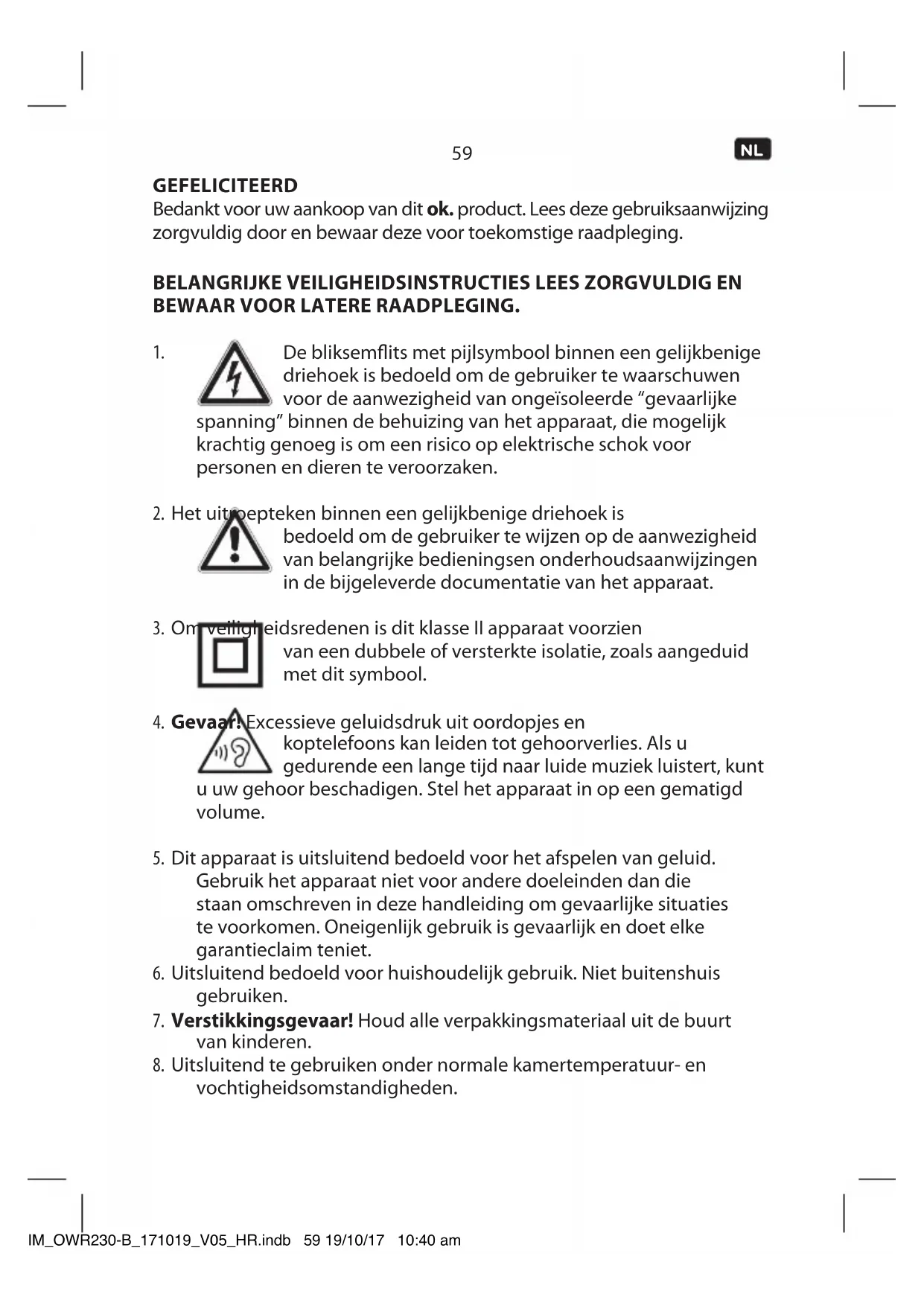 dienovereenkomstig. Voorkom het contact van batterijzuur met de huid en ogen. Als u batterijzuur in uw ogen krijgt, spoel ze grondig met veel water en raadpleeg onmiddellijk een arts. Als batterijzuur in contact met uw huid komt, was het betreende lichaamsdeel met veel water en zeep. VOORGENOMEN GEBRUIK Dit apparaat is bedoeld voor het afspelen van audio via FM/AM Radio, AUX IN of hoofdtelefoon. Leder ander gebruik kan resulteren in schade aan het product of verwondingen. Dit apparaat is ontworpen voor huishoudelijk gebruik en is niet bedoeld voor commercieel gebruik. De Imtron GmbH aanvaardt geen aansprakelijkheid voor schade aan het product, voor materiële schade of persoonlijk letsel als gevolg van onzorgvuldig of onjuist gebruik van het product, of het gebruik van het product dat niet voldoet aan het doel zoals aangegeven door de fabrikant. IM_OWR230-B_171019_V05_HR.indb 62 19/10/17 10:40 am63