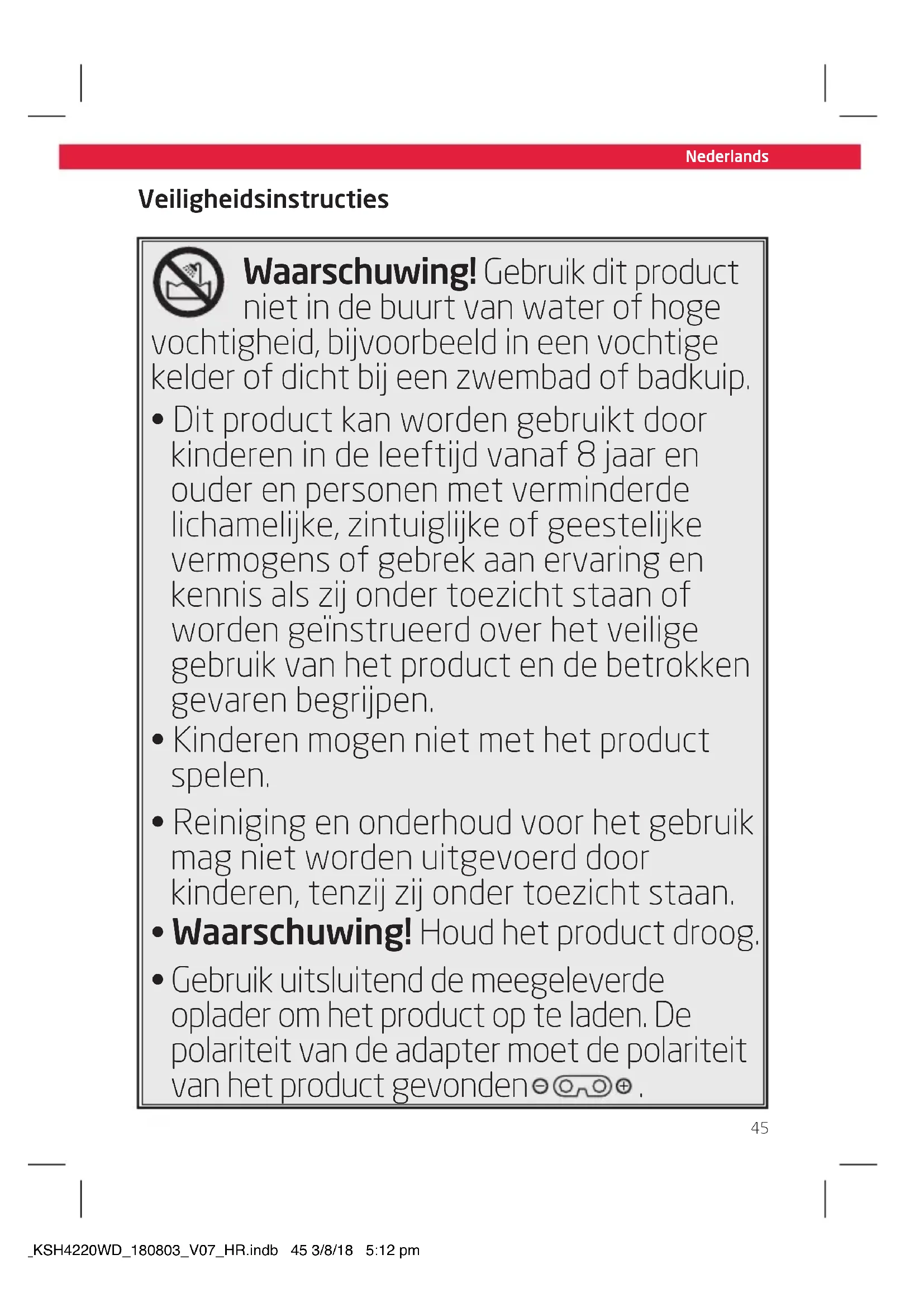 rasatura al rasoio come descritto nel capitolo Pulizia e manutenzione. IM_KSH4220WD_180803_V07_HR.indb 44 3/8/18 5:12 pm45 Nederlands Veiligheidsinstructies Waarschuwing! Gebruik dit product niet in de buurt van water of hoge vochtigheid, bijvoorbeeld in een vochtige kelder of dicht bij een zwembad of badkuip.