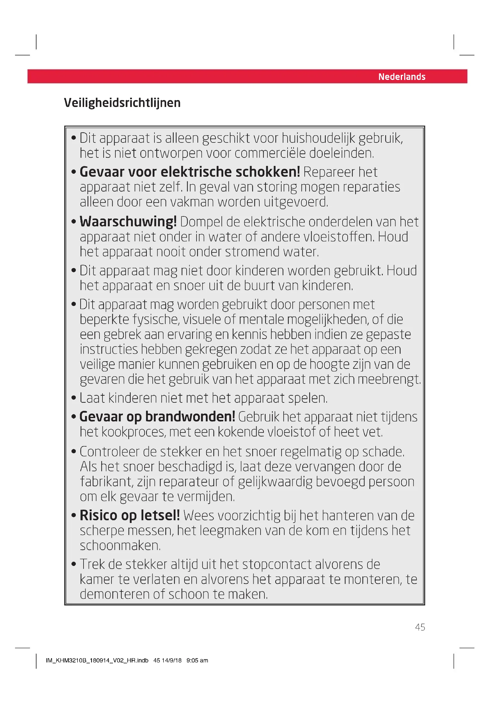 - Trek de stekker altijd uit het stopcontact alvorens de kamer te verlaten en alvorens het apparaat te monteren, te demonteren of schoon te maken. IM_KHM3210B_180914_V02_HR.indb 45 14/9/18 9:05 am46 Nederlands Size - A5 Veiligheidsrichtlijnen