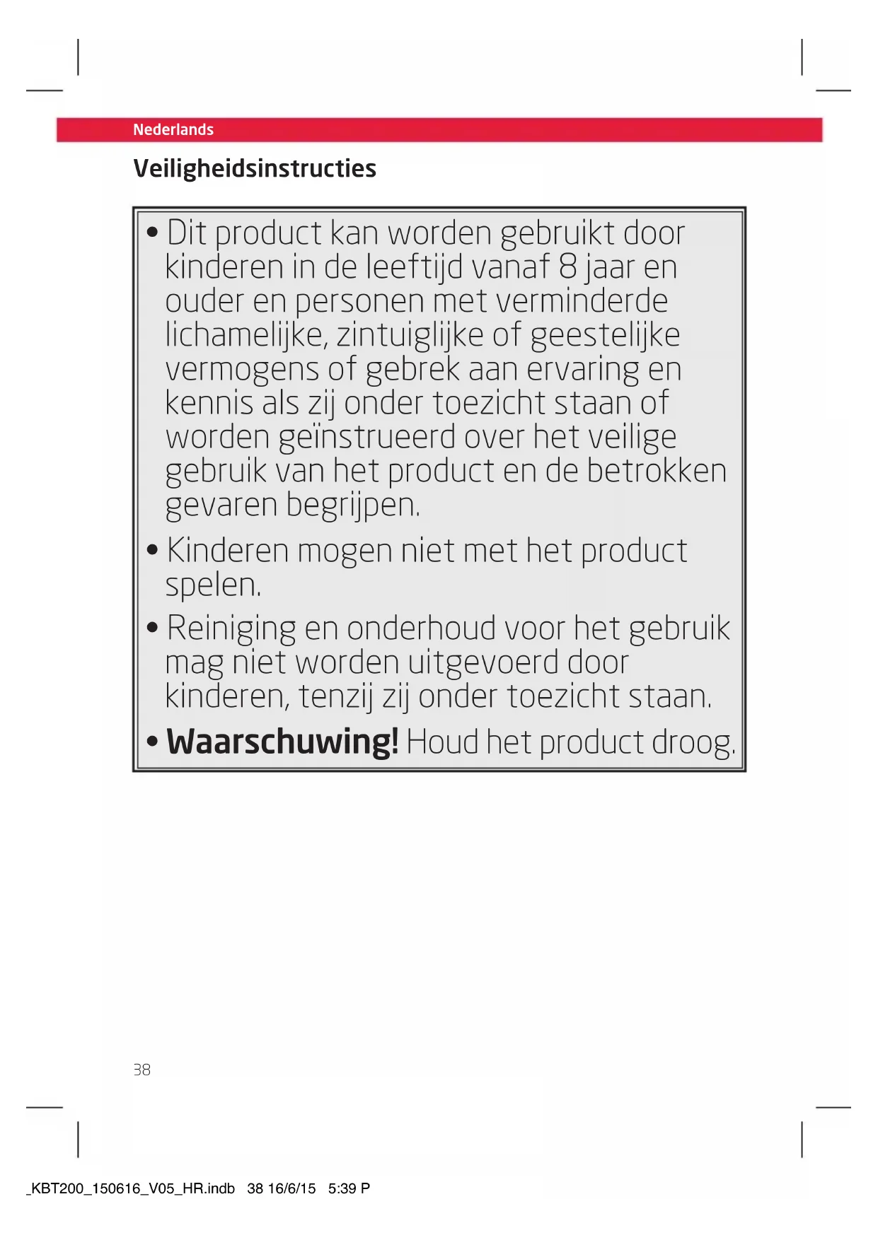 - Dit product kan worden gezruikt door kinderen in de leeftijd vanaf 8aar en ouder en personen met verminderde lichamelijke, zintuiglijke of geestelijkke vermogens of gebrek aan ervaring en kennis als zich onder toezicht staan of worden geinstrueerd over het veilige gebruik van het product en de betrokken bevaren begrijpen.