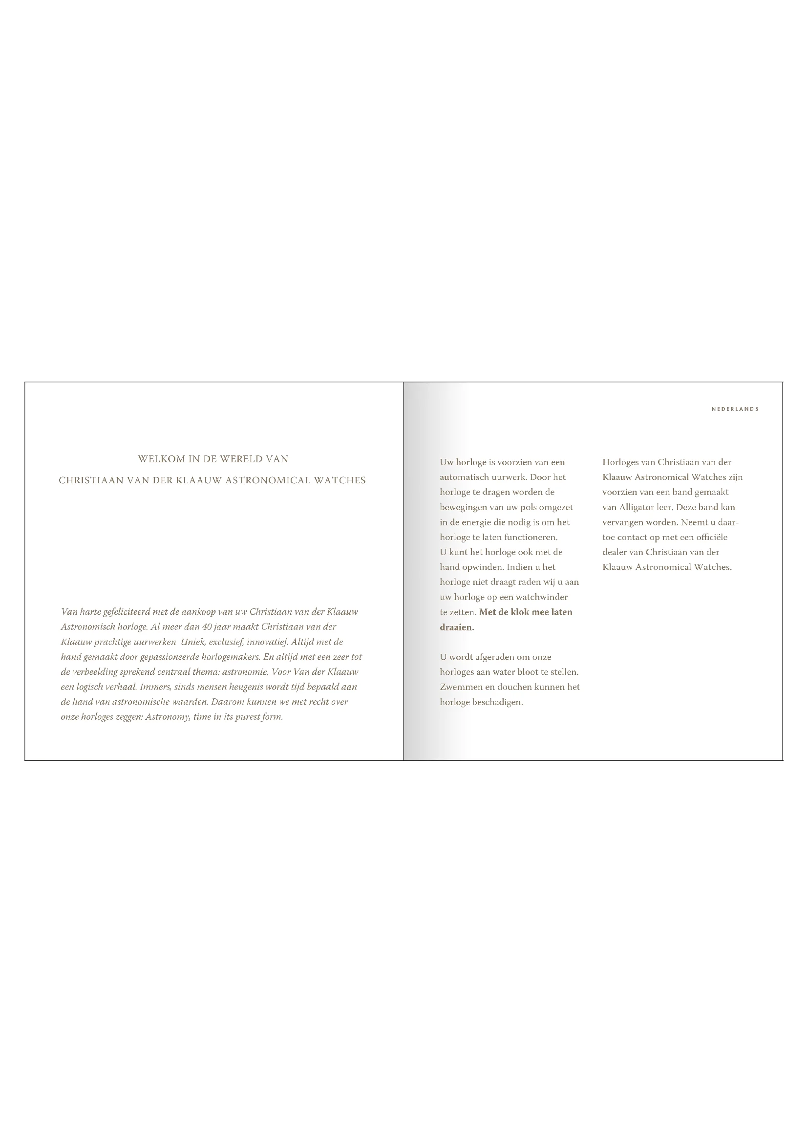 | WELKOM IN DE WERELD VANCHRISTIAAN VAN DER KLAAUW ASTRONOMICAL WATCHESVan harte gefeliciteerd met de aankoop van uw Christiaan van der KlaauwAstronomisch horloge. Almeer dan 40aar maakt Christiaan van derKlaauw prachtige uurwerken Uniek, exclusief, innovatief. Altijd met dehand gemaatkt door gespassioneerde horlogemakers. En altiid met een zeer totde verbeelding sprekind centraal theme: astronomie. Voor Van der Klaauween logisch verhaal. Immers, sinds mensen heugenis wordenijd bepaald aande hand van astronomische waarden. Daarom hunnen we metrecht overonne horloges zaggen: Astronomy, time in its purest form. | NEDERLANDSUw horloge is voorzien van eenautomatisch uurwerk. Door hethorloge te dragen worden debewegingen van uw Pols omgezetin de energie die nodig is om hethorloge te latent functioneren.U kunt het horloge ook met dehand opwinden. Indien u hethorloge Niet draagt raden wij u aanuw horloge op een watchwinderte zetten. Met de klok mee latendraaien.U wordt afgeraden om onsehorloges aan water bloot te stellen.Zwammen en douchen hunnen hethorloge beschadigen. | Horloges van Christiaan van derKlaauw Astronomical Watches zijnvoorzien van een band gemaaktvan Alligator leer. Deze band kanervangen worden. Neemt u daartoe contact op met een officielledealer van Christiaan van derKlaauw Astronomical Watches. |