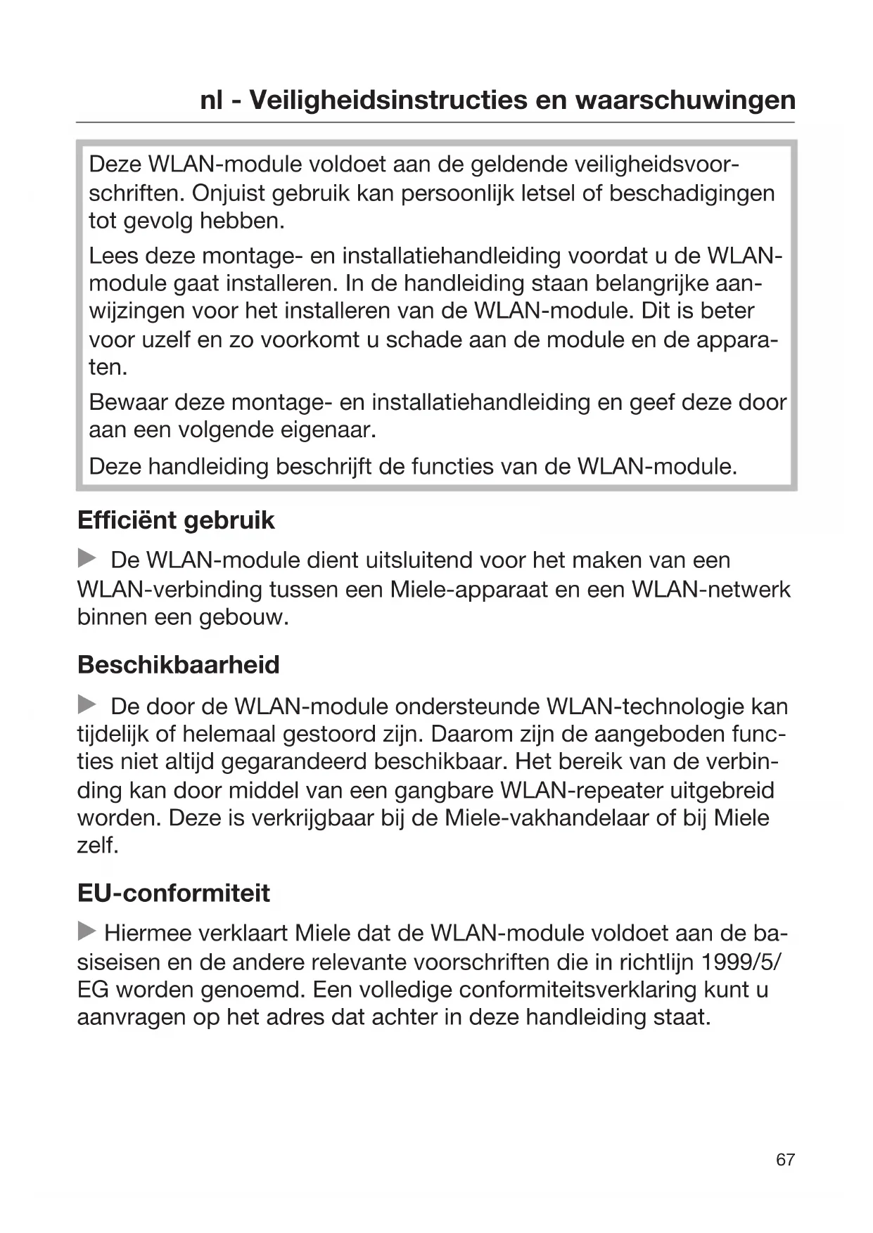 Deze WLAN-module voldoet aan de geldende veiligheidsvoor- schriften. Onjuist gebruik kan persoonlijk letsel of beschadigingen tot gevolg hebben. Lees deze montage- en installatiehandleiding voordat u de WLAN- module gaat installeren. In de handleiding staan belangrijke aan- wijzingen voor het installeren van de WLAN-module. Dit is beter voor uzelf en zo voorkomt u schade aan de module en de appara- ten. Bewaar deze montage- en installatiehandleiding en geef deze door aan een volgende eigenaar. Deze handleiding beschrijft de functies van de WLAN-module. Efficiënt gebruik De WLAN-module dient uitsluitend voor het maken van een WLAN-verbinding tussen een Miele-apparaat en een WLAN-netwerk binnen een gebouw. Beschikbaarheid De door de WLAN-module ondersteunde WLAN-technologie kan tijdelijk of helemaal gestoord zijn. Daarom zijn de aangeboden func- ties niet altijd gegarandeerd beschikbaar. Het bereik van de verbin- ding kan door middel van een gangbare WLAN-repeater uitgebreid worden. Deze is verkrijgbaar bij de Miele-vakhandelaar of bij Miele zelf. EU-conformiteit Hiermee verklaart Miele dat de WLAN-module voldoet aan de ba- siseisen en de andere relevante voorschriften die in richtlijn 1999/5/ EG worden genoemd. Een volledige conformiteitsverklaring kunt u aanvragen op het adres dat achter in deze handleiding staat.nl - Veiligheidsinstructies en waarschuwingen