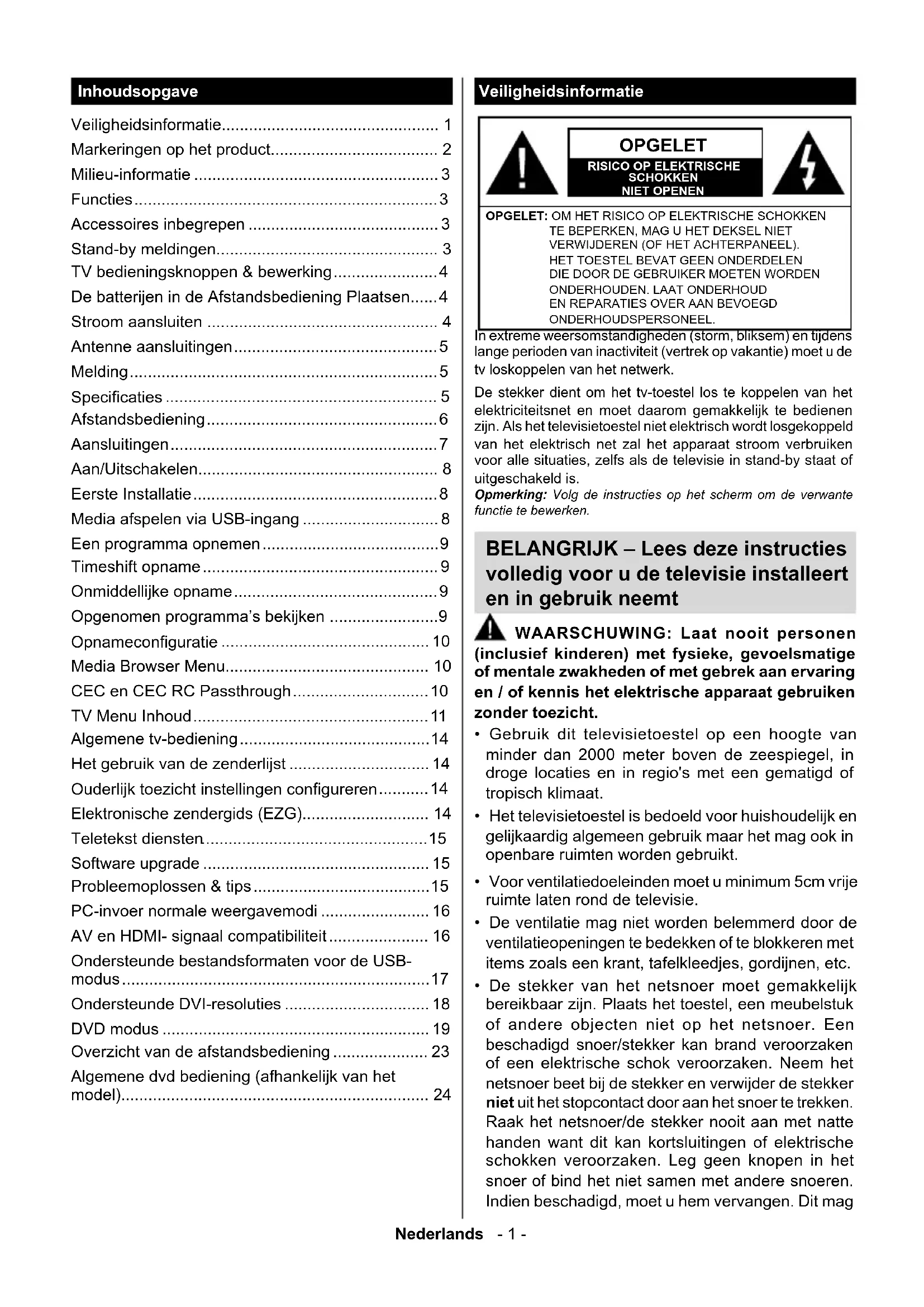 Algemene dvd bediening (afhankelijk van het model).................................................................... 24 Veiligheidsinformatie OPGELET RISICO OP ELEKTRISCHE SCHOKKENNIET OPENENOPGELET: OM HET RISICO OP ELEKTRISCHE SCHOKKEN TE BEPERKEN, MAG U HET DEKSEL NIET VERWIJDEREN (OF HET ACHTERPANEEL). HET TOESTEL BEVAT GEEN ONDERDELEN DIE DOOR DE GEBRUIKER MOETEN WORDEN ONDERHOUDEN. LAAT ONDERHOUD EN REPARATIES OVER AAN BEVOEGD ONDERHOUDSPERSONEEL. Opmerking: Volg de instructies op het scherm om de verwante functie te bewerken. In extreme weersomstandigheden (storm, bliksem) en tijdens lange perioden van inactiviteit (vertrek op vakantie) moet u de tv loskoppelen van het netwerk. De stekker dient om het tv-toestel los te koppelen van het elektriciteitsnet en moet daarom gemakkelijk te bedienen zijn. Als het televisietoestel niet elektrisch wordt losgekoppeld van het elektrisch net zal het apparaat stroom verbruiken voor alle situaties, zelfs als de televisie in stand-by staat of uitgeschakeld is. BELANGRIJK – Lees deze instructies volledig voor u de televisie installeert en in gebruik neemt WAARSCHUWING: Laat nooit personen (inclusief kinderen) met fysieke, gevoelsmatige of mentale zwakheden of met gebrek aan ervaring en / of kennis het elektrische apparaat gebruiken zonder toezicht.