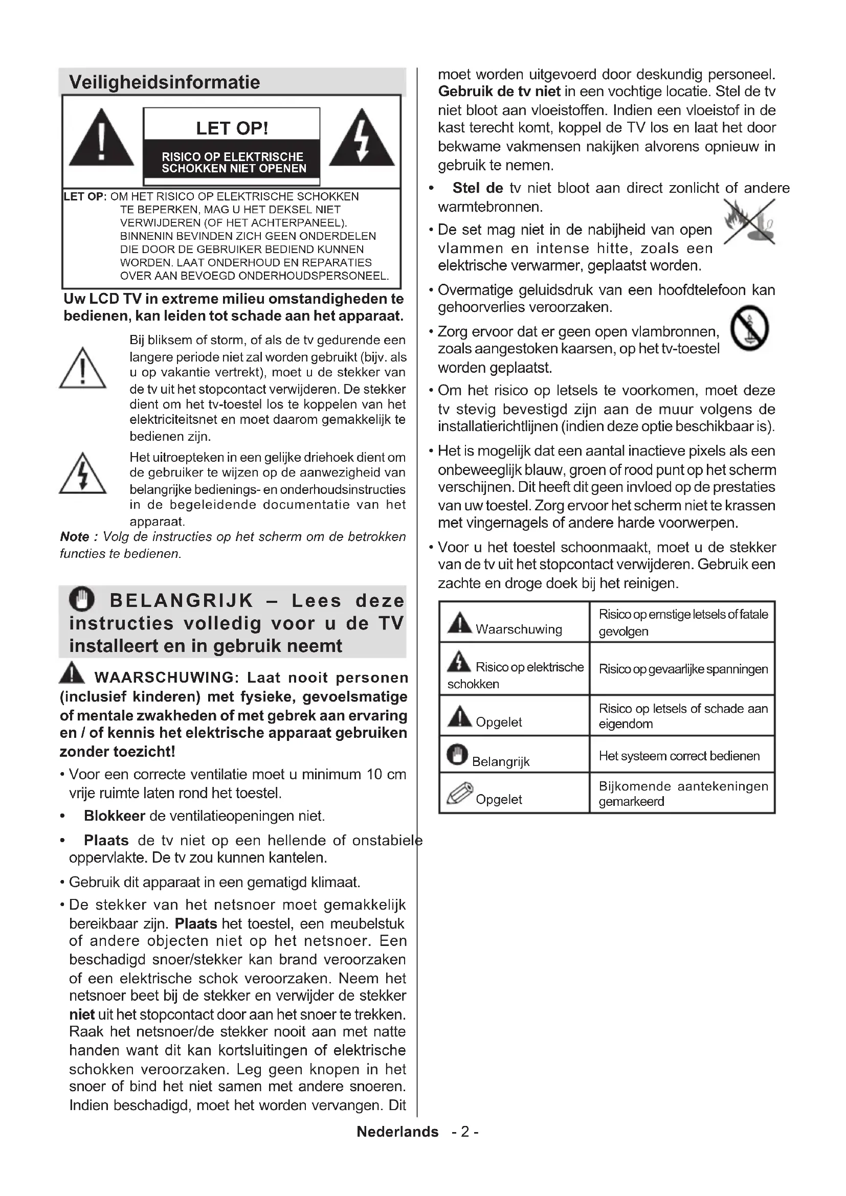 - AV en HDMI- signaal compatibiliteit Nederlands - 2 - Veiligheidsinformatie Uw LCD TV in extreme milieu omstandigheden te bedienen, kan leiden tot schade aan het apparaat. LET OP! RISICO OP ELEKTRISCHE SCHOKKEN NIET OPENENLET OP: OM HET RISICO OP ELEKTRISCHE SCHOKKEN TE BEPERKEN, MAG U HET DEKSEL NIET VERWIJDEREN (OF HET ACHTERPANEEL).BINNENIN BEVINDEN ZICH GEEN ONDERDELEN DIE DOOR DE GEBRUIKER BEDIEND KUNNEN WORDEN. LAAT ONDERHOUD EN REPARATIES OVER AAN BEVOEGD ONDERHOUDSPERSONEEL. Note : Volg de instructies op het scherm om de betrokken functies te bedienen. Bij bliksem of storm, of als de tv gedurende een langere periode niet zal worden gebruikt (bijv. als u op vakantie vertrekt), moet u de stekker van de tv uit het stopcontact verwijderen. De stekker dient om het tv-toestel los te koppelen van het elektriciteitsnet en moet daarom gemakkelijk te bedienen zijn. Het uitroepteken in een gelijke driehoek dient om de gebruiker te wijzen op de aanwezigheid van belangrijke bedienings- en onderhoudsinstructies in de begeleidende documentatie van het apparaat. BELANGRIJK – Lees deze instructies volledig voor u de TV installeert en in gebruik neemt WAARSCHUWING: Laat nooit personen (inclusief kinderen) met fysieke, gevoelsmatige of mentale zwakheden of met gebrek aan ervaring en / of kennis het elektrische apparaat gebruiken zonder toezicht! p. 15