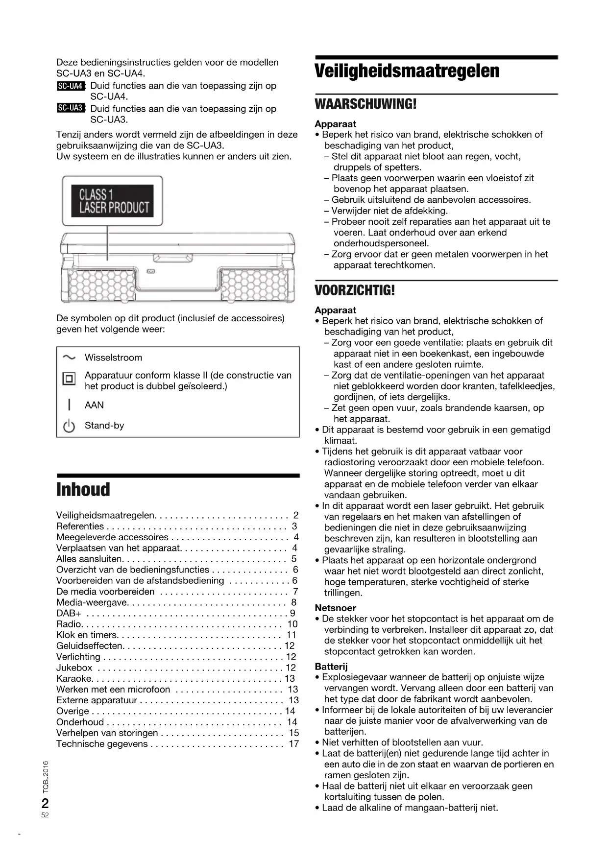 - Laad de alkaline of mangaan-batterij niet. SC-UA4 : SC-UA3 : Duid functies aan die van toepassing zijn op SC-UA4. Duid functies aan die van toepassing zijn op SC-UA3. Wisselstroom Apparatuur conform klasse II (de constructie van het product is dubbel geïsoleerd.) AAN Stand-by UA3.4E_TQBJ2016.book Page 2 Wednesday, June 7, 2017 3:10 PM3 TQBJ2016