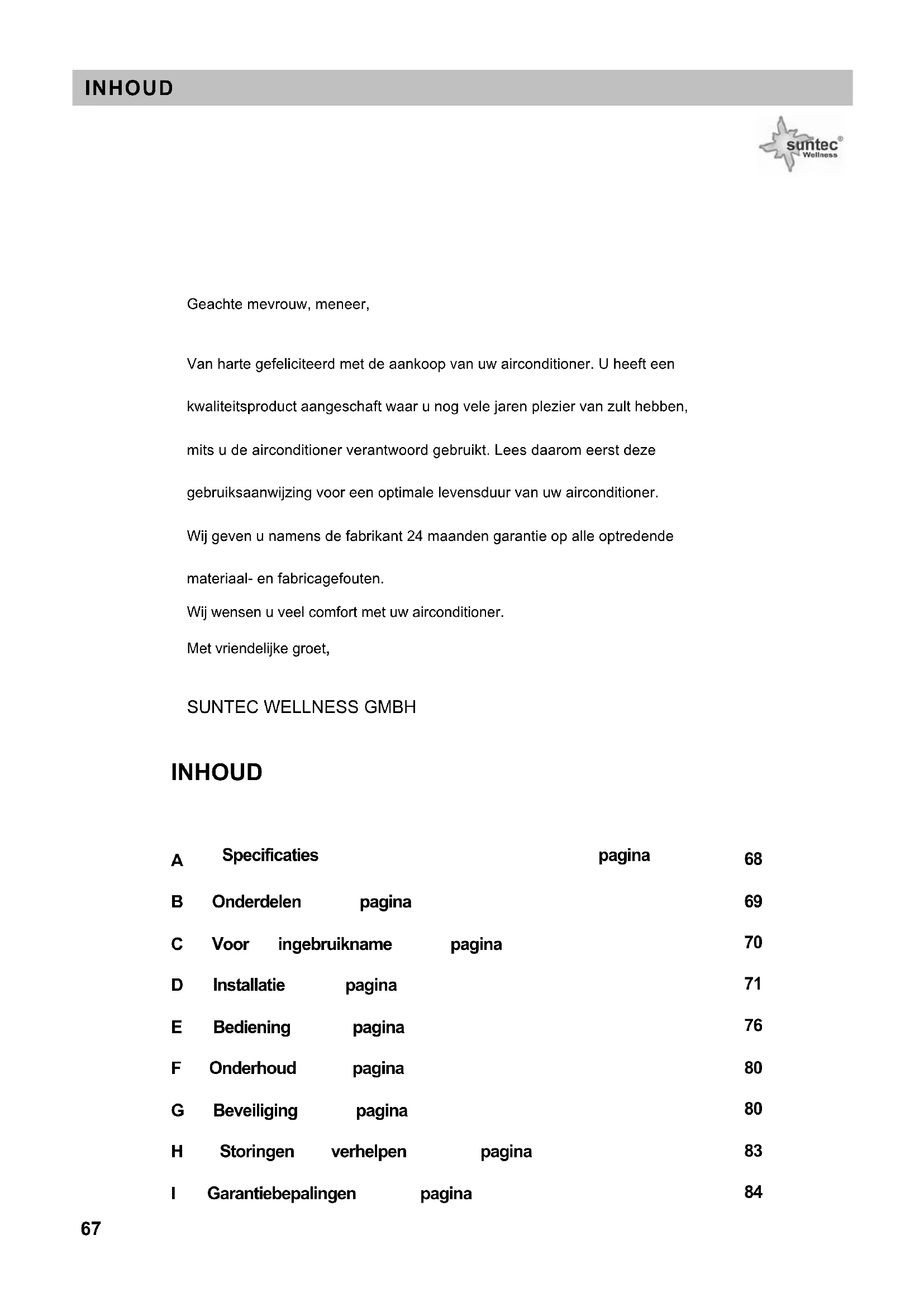 Probleem Oorzaak / Oplossing Unit werkt niet. De stekker zit niet goed in het stopcontact. De batterijen van de afstandsbediening zijn leeg. De beveiliging is geactiveerd of de zekering is doorgebrand. Geen gekoelde of verwarmde lucht. Zijn de luchtinlaten, –uitlaten geblokkeerd? Is de temperatuur goed ingesteld? Is de luchtfilter verontreinigd? Geen effectieve bediening. Als gevolg van storing (door ontlading van statische elektriciteit, storing in stroomvoorziening) zal het apparaat niet goed functioneren. Als dat het geval is, de stekker uit het stopcontact halen en na 2-3 seconden weer in het stopcontact steken. Start niet meteen. Verandering van de modus tijdens bedrijf: vertraging van 3 minuten. Vreemde lucht. Geur is mogelijk afkomstig van een andere bron, meubels sigaretten, etc. De unit blaast de aangezogen lucht weer uit. Geluid van stromend water. Veroorzaakt door het koudemiddel in de airconditioner, dit duidt niet op een storing. Geluid van ontdooien in verwarmingsmodus. Krakend geluid. Het geluid kan veroorzaakt worden door uitzetten/krimpen van het frontpaneel als gevolg van temperatuurswisselingen. Er komt damp/nevel uit de luchtuitlaat. Er ontstaat damp/nevel als de lucht in de kamer sterk afkoelt doordat tijdens de COOLING of DRY werking koude lucht wordt uitgeblazen. Het rode compressor indicatorlampje knippert constant en de ventilator van de binnenunit werkt niet meer. De unit gaat van verwarmingsmodus in ontdooimodus. Het indicatielampje gaat binnen 10 minuten uit, de unit gaat terug in de verwarmingsmodus. STORINGEN VERHELPEN 83I GARANTIEBEPALINGEN U krijgt op de airconditioner 24 maanden garantie vanaf de aankoopdatum. Binnen deze periode worden alle materiaal- en fabricagefouten kosteloos verholpen. Hierbij gelden de volgende regels: