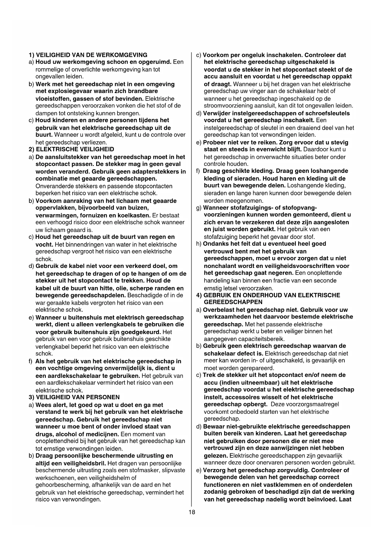 ELEKTRISCHE GEREEDSCHAPPEN WAARSCHUWING Lees alle veiligheidswaarschuwingen, aanwijzingen, afbeeldingen en specificaties die bij dit elektrische gereedschap worden geleverd. Als de hieronder vermelde aanwijzingen niet worden opgevolgd, kan dit een elektrische schok, brand en/of ernstig letsel tot gevolg hebben. Bewaar alle waarschuwingen en voorschriften voor toekomstig gebruik. Het in de waarschuwingen gebruikte begrip “elektrisch gereedschap” heeft betrekking op elektrische gereedschappen voor gebruik op het stroomnet (met netsnoer) en op elektrische gereedschappen voor gebruik met een accu (zonder netsnoer).18