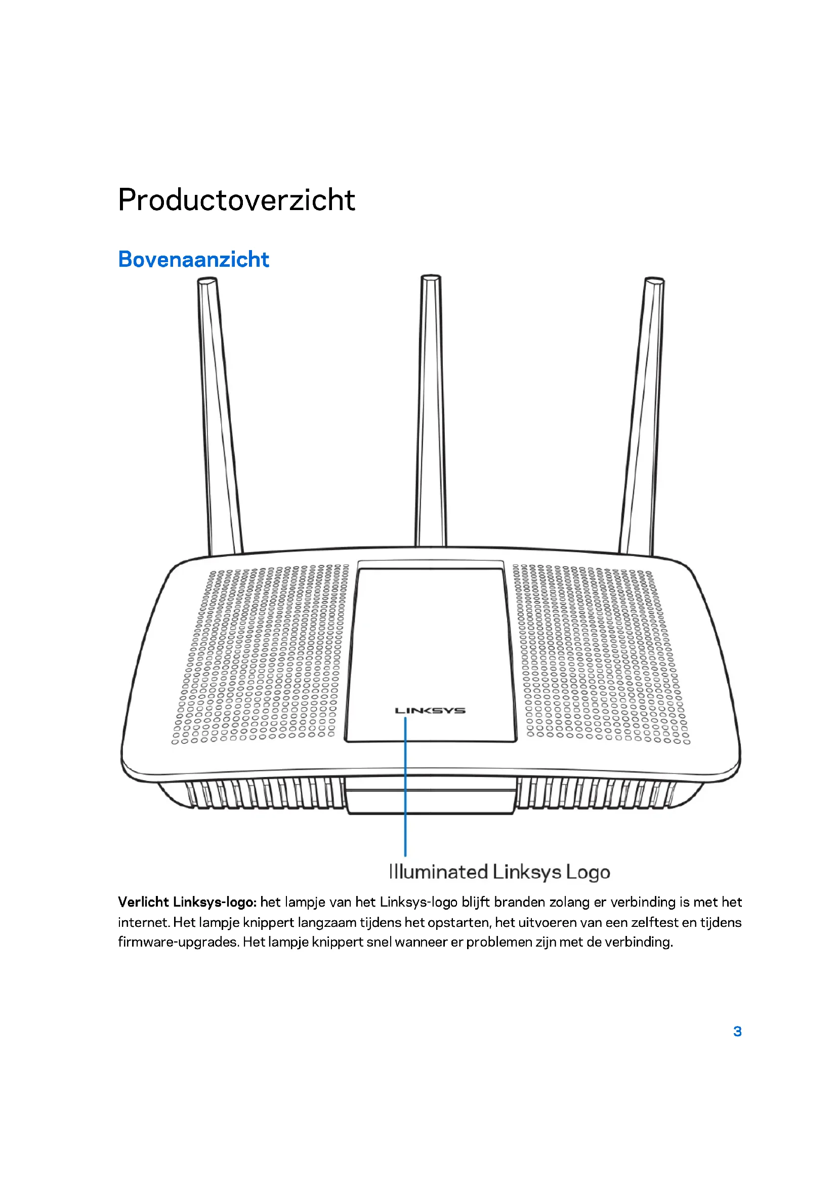 Linksys.com/support/EA7300 (documentatie, downloads, veelgestelde vragen, technische ondersteuning, live chat, forums) Let op: Licenties en kennisgevingen voor software van derden die gebruikt worden voor dit product, vindt u op http://support.linksys.com/en-us/license. Voor vragen of verzoeken om de GPL-broncodebestanden kunt u contact opnemen via http://support.linksys.com/en- us/gplcodecenter . Uw router installeren