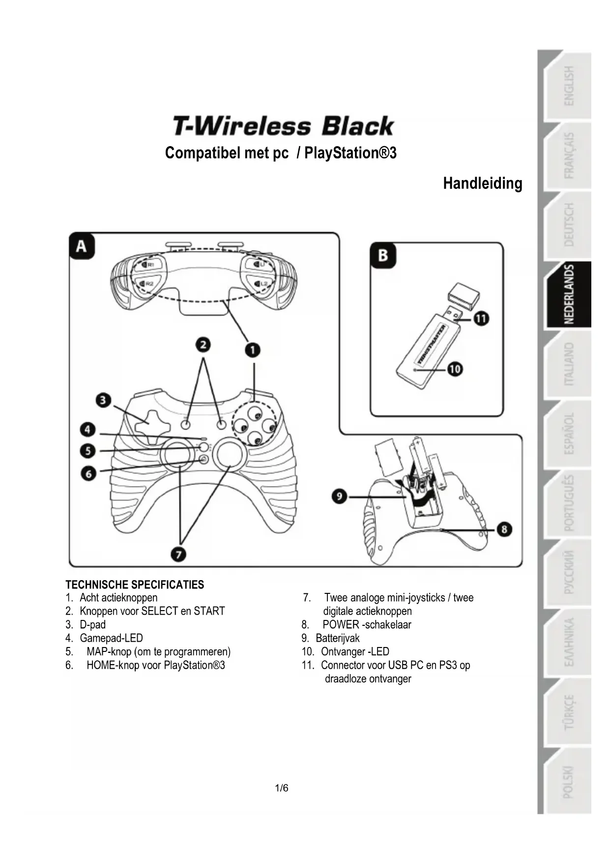 - Ik kan mijn gamepad niet configureren: - Ga in de game naar het menu met opties voor de controller en de gamepad. Selecteer de meest geschikte configuratie. - Raadpleeg de handleiding of de online help van de game voor meer informatie. - U kunt ook de programmeerfunctie van uw gamepad gebruiken om dit soort problemen op te lossen. Wanneer u de gamepad niet meer gebruikt, adviseren wij de POWER-schakelaar (9) van de gamepad altijd in de OFF-stand te zetten om de batterijen te sparen.4/6 Informatie met betrekking tot kopersgarantie Wereldwijd garandeert Guillemot Corporation S.A., het statutair adres gevestigd aan de Place du Granier, B.P. 97143, 35571 Chantepie, Frankrijk, (hierna te noemen “Guillemot”) aan de de koper dat dit Thrustmaster-product vrij zal zijn van materiaal- en fabricagefouten gedurende een garantieperiode gelijk aan de tijd maximaal vereist om een restitutie/vervanging voor dit product te claimen. In landen van de Europese Unie komt dit overeen met een periode van twee (2) jaar vanaf het moment van levering van het Thrustmaster-product. In andere landen komt de garantieperiode overeen met de tijd maximaal vereist om een restitutie/vervanging voor dit Thrustmaster-product te claimen zoals wettelijk is vastgelegd in het land waarin de koper woonachtig was op de datum van aankoop van het Thrustmaster-product. Indien een dergelijk claimrecht niet wettelijk is vastgelegd in het betreffende land, geldt een garantieperiode van één (1) jaar vanaf datum aankoop van het Thrustmaster-product. Indien u in de garantieperiode een defect meent te constateren aan dit product, neem dan onmiddellijk contact op met Technical Support die u zal informeren over de te volgen procedure. Als het defect wordt bevestigd, dient het product te worden geretourneerd naar de plaats van aankoop (of een andere locatie die wordt opgegeven door Technical Support). Binnen het gestelde van deze garantie wordt het defecte product van de koper gerepareerd of vervangen, zulks ter beoordeling van Technical Support. Indien het Thrustmaster- product tijdens de garantieperiode is onderworpen aan een dergelijk herstel, wordt elke periode van ten minste zeven (7) dagen waarin het product niet in gebruik is, opgeteld bij de resterende garantieperiode (deze periode loopt vanaf de datum van verzoek van de consument voor interventie of vanaf de datum waarop het product in kwestie beschikbaar is gesteld voor herstel als de datum waarop het product ter beschikking wordt gesteld voor herstel later is dan de datum van het verzoek om interventie). Indien toegestaan door van toepassing zijnde wetgeving, beperkt de volledige aansprakelijkheid van Guillemot en haar dochterondernemingen (inclusief de aansprakelijkheid voor vervolgschade) zich tot het repareren of vervangen van het Thrustmaster-product. Indien toegestaan door van toepassing zijnde wetgeving, wijst Guillemot elke garantie af met betrekking tot verhandelbaarheid of geschiktheid voor enig doel. Deze garantie is niet van kracht: (1) indien het product aangepast, geopend of gewijzigd is, of beschadigd is ten gevolge van oneigenlijk of onvoorzichtig gebruik, verwaarlozing, een ongeluk, normale slijtage, of enige andere oorzaak die niet gerelateerd is aan een materiaal- of fabricagefout (inclusief maar niet beperkt tot het combineren van het Thrustmaster-product met enig ongeschikt element waaronder in het bijzonder voedingsadapters, oplaadbare batterijen, opladers of enig ander element niet geleverd door Guillemot voor dit product); (2) als het product is gebruikt voor enig ander doel dan thuisgebruik, zoals maar niet exclusief een professioneel of commercieel doel (bijvoorbeeld game rooms, training, wedstrijden); (3) indien u zich niet houdt aan de instructies zoals verstrekt door Technical Support; (4) op software die onder een specifieke garantie valt; (5) op verbruiksartikelen (elementen die tijdens de levensduur van het product worden vervangen zoals bijvoorbeeld batterijen of pads van een headset of koptelefoon); (6) op accessoires (zoals bijvoorbeeld kabels, behuizingen, hoesjes, etui's, draagtassen of polsbandjes); (7) indien het product werd verkocht op een openbare veiling. Deze garantie is niet overdraagbaar. De wettelijke rechten van de koper die in zijn/haar land van toepassing zijn op de verkoop van consumentproducten worden op generlei wijze door deze garantie beperkt.5/6 Aanvullende garantiebepalingen Gedurende de garantieperiode zal Guillemot in principe nooit reserveonderdelen leveren omdat Technical Support de enige partij is die bevoegd is een Thrustmaster-product te openen en/of te herstellen (met uitzondering van een herstelprocedure die de klant door Technical Support gevraagd wordt uit te voeren met behulp van schriftelijke instructies – omdat deze procedure bijvoorbeeld eenvoudig is en het herstelproces niet vertrouwelijk is – en door het verstrekken aan de consument van de benodigde onderdelen, indien van toepassing). Gezien de innovatiecycli en om haar knowhow en handelsgeheimen te beschermen, zal Guillemot in principe nooit een herstelbeschrijving of reserveonderdelen verstrekken voor een Thrustmaster-product waarvan de garantieperiode is verstreken. Aansprakelijkheid Indien toegestaan door van toepassing zijnde wetgeving, wijzen Guillemot Corporation S.A. (hierna te noemen “Guillemot”) en haar dochterondernemingen alle aansprakelijkheid af voor enige schade veroorzaakt door één van de volgende oorzaken: (1) indien het product aangepast, geopend of gewijzigd is; (2) de montage-instructies niet zijn opgevolgd; (3) oneigenlijk of onvoorzichtig gebruik, verwaarlozing, een ongeluk (bijvoorbeeld stoten); (4) normale slijtage; (5) het gebruik van het product voor enig ander doel dan thuisgebruik, zoals maar niet exclusief een professioneel of commercieel doel (bijvoorbeeld game rooms, training, wedstrijden). Indien toegestaan onder van toepassing zijnde wetgeving, wijzen Guillemot en haar dochterondernemingen alle aansprakelijkhe