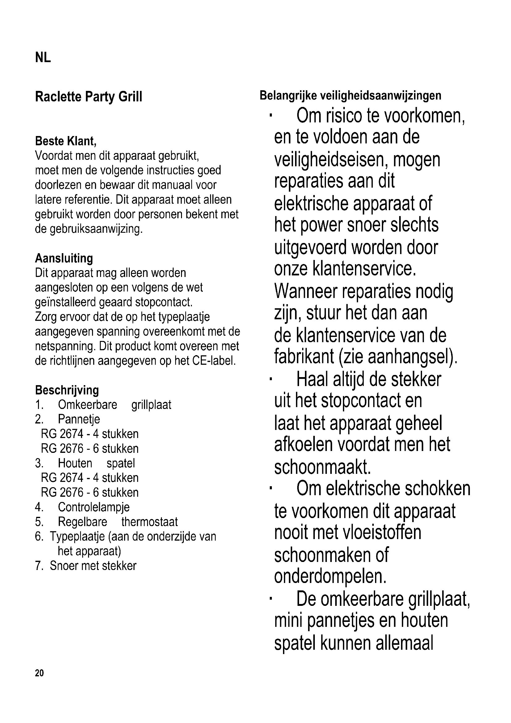 Belangrijke veiligheidsaanwijzingen ∙ Om risico te voorkomen, en te voldoen aan de veiligheidseisen, mogen reparaties aan dit elektrische apparaat of het power snoer slechts uitgevoerd worden door onze klantenservice. Wanneer reparaties nodig zijn, stuur het dan aan de klantenservice van de fabrikant (zie aanhangsel). ∙ Haal altijd de stekker uit het stopcontact en laat het apparaat geheel afkoelen voordat men het schoonmaakt. ∙ Om elektrische schokken te voorkomen dit apparaat nooit met vloeistoffen schoonmaken of onderdompelen. ∙ De omkeerbare grillplaat, mini pannetjes en houten spatel kunnen allemaal NL21 schoongemaakt worden in warm water met zeep. Voor uitvoerige informatie over het schoonmaken van het apparaat, raadpleeg de sectie Schoonmaken en onderhoud. ∙ Dit apparaat is niet geschikt voor gebruik met een externe tijdklok of een apart afstandsbediening systeem. ∙ Dit apparaat is bestemd voor huishoudelijk of gelijkwaardig gebruik, zoals - in bedrijfskeukens, in winkels, kantoren of andere bedrijfsruimtes, - in agrarische instellingen, - door klanten in hotels, motels enz. en gelijkwaardige accommodaties, - in bed and breakfast gasthuizen. ∙ Dit apparaat mag gebruikt worden door kinderen (tenminste 8 jaar oud) en door personen met verminderde fysische, zintuiglijke of mentale bekwaamheden, of gebrek van ervaring en kennis, wanneer deze onder begeleiding zijn of instructies ontvangen hebben over het gebruik van dit apparaat en volledig de gevaren en veiligheidsvoorschriften begrijpen. ∙ Kinderen mogen niet met het apparaat spelen. ∙ Kinderen mogen in geen geval dit apparaat schoonmaken of onderhoudswerkzaamheden uitvoeren behalve wanneer onder toezicht van een volwassene en ze tenminste 8 jaar oud zijn. ∙ Het apparaat en het22 snoer moeten altijd goed weggehouden worden van kinderen jonger dan 8 jaar. ∙ Waarschuwing: Houdt kinderen weg van inpakmateriaal, daar deze een bron van gevaar zijn bv. door verstikking. ∙ Voordat het apparaat gebruikt wordt moet het hoofddeel inclusief het snoer evenals welk hulpstuk dan ook dat wordt aangebracht, zorgvuldig gecontroleerd worden op eventuele gebreken of defecten. Ingeval het apparaat, bijvoorbeeld, op een hard oppervlak is gevallen, of wanneer men met overdadige kracht aan het power snoer getrokken heeft, mag men het niet meer gebruiken: zelfs onzichtbare beschadiging kan ongewenste effecten hebben op de gebruiksveiligheid van het apparaat. ∙ Het snoer moet vrijgehouden worden van hete onderdelen van het apparaat. ∙ Waarschuwing: Er is gevaar voor verbranding. De oppervlaktes van de behuizing, het grill gebied en mini pannetjes worden heet tijdens gebruik en zullen voor een lange periode heet blijven. ∙ Geef het apparaat altijd voldoende tijd om af te koelen voordat men de grillplaat verwijdert, en voordat men de unit schoonmaakt of opbergt. ∙ Laat dit apparaat nooit onbeheerd achter. ∙ Tijdens gebruik moet het apparaat altijd op een hittebestendige ondergrond geplaatst zijn die tevens bestand is tegen spetteren en vlekken. Wanneer men voedsel roostert met een hoog vetgehalte kan spetteren niet altijd voorkomen worden. ∙ De grill niet bij een muur of in een hoek plaatsen, en zorg ervoor dat in de buurt ervan geen ontvlambare materialen worden opgeslagen. ∙ Het apparaat mag alleen gebruikt worden met de omkeerbare grillplaat op de juiste wijze boven het verwarmingselement geplaatst. ∙ Pas op: Gebruik dit apparaat niet buitenshuis. ∙ Verwijder altijd de stekker uit het stopcontact: - na gebruik, - wanneer het apparaat niet werkt, - wanneer men het apparaat schoonmaakt. ∙ Trek de stekker niet aan het snoer uit het stopcontact, trek aan de stekker zelf. ∙ Dit apparaat mag alleen gebruikt worden met de door de fabrikant bijgeleverde hulpstukken. ∙ De fabrikant heeft geen verantwoordelijkheid wanneer dit apparaat verkeerd gebruikt word of wanneer de veiligheidsinstructies niet gevolgd worden.23 Eerste ingebruikname ∙ Alle verpakkingsmaterialen en stickers van het apparaat verwijderen. ∙ Voordat het apparaat voor de eerste keer wordt aangezet, de omkeerbare grillplaat, houten spatels en mini pannetjes schoonvegen met een vochtige doek. ∙ Verwarm het apparaat en de pannetjes voor ongeveer 30 minuten zonder voedsel, om de typische reuk, welke van de grill afkomt wanneer men deze voor de eerste keer aanzet, te laten verdwijnen (een lichte rookontwikkeling kan zichtbaar zijn). Zorg voor voldoende ventilatie door het openen van ramen en balkondeuren. ∙ Laat de grill weer afkoelen. ∙ Maak het schoon zoals beschreven in de sectie Schoonmaken en onderhoud. Omkeerbare grillplaat ∙ De geribbelde zijde van de omkeerbare grillplaat is speciaal geschikt voor het grillen van vlees, zoals biefstuk, worstjes etc. ∙ De gladde zijde van de omkeerbare grillplaat wordt gebruikt voor het grillen van groenten en zeebanket. ∙ Voordat het apparaat aangezet wordt, de omkeerbare grillplaat bovenop het apparaat plaatsen, over het verwarmingselement, en ervoor zorgen dat de uitsparingen in de plaat goed passen op corresponderende steunen. Regelbare thermostaat ∙ De verstelbare thermostaat regelt de werkingstijd van het verwarmingselement. Voor het grillen of smelten, de thermostaat helemaal rechtsom draaien naar zijn maximale stand. Om het eten warm te houden, de thermostaat linksom terugdraaien. ∙ Het indicatielampje geeft de bedrijfsstatus van het verwarmingselement aan. Verwarmingselement aan = indicatielampje aan Verwarmingselement uit = indicatielampje uit Voorbereiden van raclette kaas Knip 200 tot 300 gram zacht snijkaas per persoon af in plakken van ongeveer