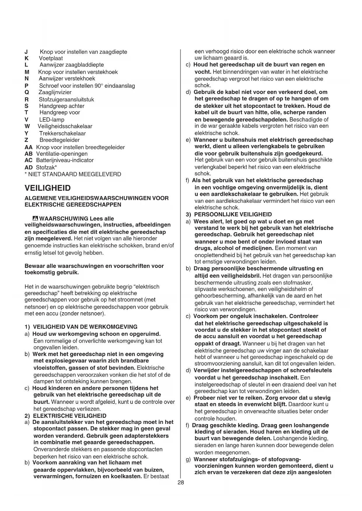 a) Wees alert, let goed op wat u doet en ga met verstand te werk bij het gebruik van het elektrische gereedschap. Gebruik het gereedschap niet wanneer u moe bent of onder invloed staat van drugs, alcohol of medicijnen. Een moment van onoplettendheid bij het gebruik van het gereedschap kan tot ernstige verwondingen leiden. b) Draag persoonlijke beschermende uitrusting en altijd een veiligheidsbril. Het dragen van persoonlijke beschermende uitrusting zoals een stofmasker, slipvaste werkschoenen, een veiligheidshelm of gehoorbescherming, afhankelijk van de aard en het gebruik van het elektrische gereedschap, vermindert het risico van verwondingen. c) Voorkom per ongeluk inschakelen. Controleer dat het elektrische gereedschap uitgeschakeld is voordat u de stekker in het stopcontact steekt of de accu aansluit en voordat u het gereedschap oppakt of draagt. Wanneer u bij het dragen van het elektrische gereedschap uw vinger aan de schakelaar hebt of wanneer u het gereedschap ingeschakeld op de stroomvoorziening aansluit, kan dit tot ongevallen leiden. d) Verwijder instelgereedschappen of schroefsleutels voordat u het gereedschap inschakelt. Een instelgereedschap of sleutel in een draaiend deel van het gereedschap kan tot verwondingen leiden. e) Probeer niet ver te reiken. Zorg ervoor dat u stevig staat en steeds in evenwicht blijft. Daardoor kunt u het gereedschap in onverwachte situaties beter onder controle houden. f) Draag geschikte kleding. Draag geen loshangende kleding of sieraden. Houd haren en kleding uit de buurt van bewegende delen. Loshangende kleding, sieraden en lange haren kunnen door bewegende delen worden meegenomen. g) Wanneer stofafzuigings- of stofopvang- voorzieningen kunnen worden gemonteerd, dient u zich ervan te verzekeren dat deze zijn aangesloten J Knop voor instellen van zaagdiepte K Voetplaat L Aanwijzer zaagbladdiepte M Knop voor instellen verstekhoek N Aanwijzer verstekhoek P Schroef voor instellen 90° eindaanslag Q Zaaglijnvizier R Stofzuigeraansluitstuk S Handgreep achter T Handgreep voor V LED-lamp W Veiligheidsschakelaar Y Trekkerschakelaar Z Breedtegeleider AA Knop voor instellen breedtegeleider AB Ventilatie-openingen AC Batterijniveau-indicator AD Stofzak*