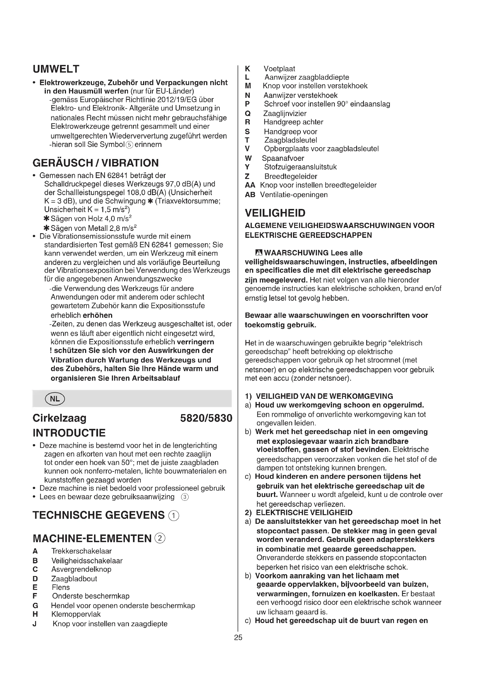 benutzen - die Qualität des Schnittes erhöht sich mit der Anzahl der Zähne - Hartmetallbestückte Sägeblätter haben eine bis zu 30 Mal längere Lebensdauer als konventionelle Sägeblätter25 K Voetplaat L Aanwijzer zaagbladdiepte M Knop voor instellen verstekhoek N Aanwijzer verstekhoek P Schroef voor instellen 90° eindaanslag Q Zaaglijnvizier R Handgreep achter S Handgreep voor T Zaagbladsleutel V Opbergplaats voor zaagbladsleutel W Spaanafvoer Y Stofzuigeraansluitstuk Z Breedtegeleider AA Knop voor instellen breedtegeleider AB Ventilatie-openingen VEILIGHEID