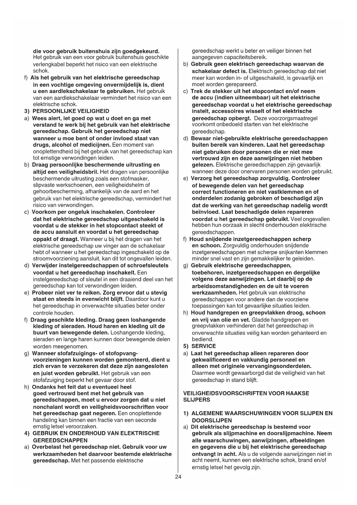 GEREEDSCHAPPEN a) Overbelast het gereedschap niet. Gebruik voor uw werkzaamheden het daarvoor bestemde elektrische gereedschap. Met het passende elektrische25 verwondingen veroorzaken, ook buiten de directe werkomgeving. j) Houd het elektrische gereedschap alleen vast aan de geïsoleerde greepvlakken als u werkzaamheden uitvoert waarbij het inzetgereedschap verborgen stroomleidingen of de eigen stroomkabel kan raken. Contact met een onder spanning staande leiding kan ook metalen delen van het elektrische gereedschap onder spanning zetten en tot een elektrische schok leiden. k) Houd de stroomkabel uit de buurt van draaiende inzetgereedschappen. Als u de controle over het elektrische gereedschap verliest, kan de stroomkabel worden doorgesneden of meegenomen en uw hand of arm kan in het ronddraaiende inzetgereedschap terechtkomen. l) Leg het elektrische gereedschap nooit neer voordat het inzetgereedschap volledig tot stilstand is gekomen. Het draaiende inzetgereedschap kan in contact komen met het oppervlak, waardoor u de controle over het elektrische gereedschap kunt verliezen. m) Laat het elektrische gereedschap niet lopen terwijl u het draagt. Uw kleding kan door toevallig contact met het draaiende inzetgereedschap worden meegenomen en het inzetgereedschap kan zich in uw lichaam boren. n) Reinig regelmatig de ventilatieopeningen van het elektrische gereedschap. De motorventilator trekt stof in de behuizing en een sterke ophoping van metaalstof kan elektrische gevaren veroorzaken. o) Gebruik het elektrische gereedschap niet in de buurt van brandbare materialen. Vonken kunnen deze materialen ontsteken. p) Gebruik geen inzetgereedschappen waarvoor vloeibare koelmiddelen vereist zijn. Het gebruik van water of andere vloeibare koelmiddelen kan tot een elektrische schok leiden.