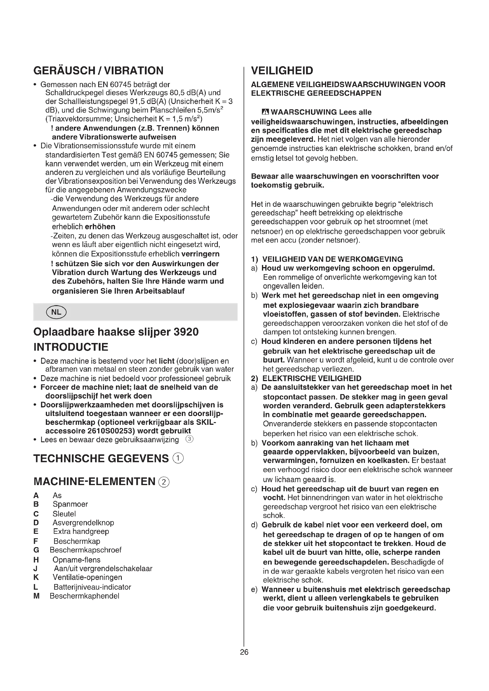 A As B Spanmoer C Sleutel D Asvergrendelknop E Extra handgreep F Beschermkap G Beschermkapschroef H Opname-ens J Aan/uit vergrendelschakelaar K Ventilatie-openingen L Batterijniveau-indicator M Beschermkaphendel27 b) Gebruik geen elektrisch gereedschap waarvan de schakelaar defect is. Elektrisch gereedschap dat niet meer kan worden in- of uitgeschakeld, is gevaarlijk en moet worden gerepareerd. c) Trek de stekker uit het stopcontact en/of neem de accu (indien uitneembaar) uit het elektrische gereedschap voordat u het elektrische gereedschap instelt, accessoires wisselt of het elektrische gereedschap opbergt. Deze voorzorgsmaatregel voorkomt onbedoeld starten van het elektrische gereedschap. d) Bewaar niet-gebruikte elektrische gereedschappen buiten bereik van kinderen. Laat het gereedschap niet gebruiken door personen die er niet mee vertrouwd zijn en deze aanwijzingen niet hebben gelezen. Elektrische gereedschappen zijn gevaarlijk wanneer deze door onervaren personen worden gebruikt. e) Verzorg het gereedschap zorgvuldig. Controleer of bewegende delen van het gereedschap correct functioneren en niet vastklemmen en of onderdelen zodanig gebroken of beschadigd zijn dat de werking van het gereedschap nadelig wordt beïnvloed. Laat beschadigde delen repareren voordat u het gereedschap gebruikt. Veel ongevallen hebben hun oorzaak in slecht onderhouden elektrische gereedschappen. f) Houd snijdende inzetgereedschappen scherp en schoon. Zorgvuldig onderhouden snijdende inzetgereedschappen met scherpe snijkanten klemmen minder snel vast en zijn gemakkelijker te geleiden. g) Gebruik elektrische gereedschappen, toebehoren, inzetgereedschappen en dergelijke volgens deze aanwijzingen. Let daarbij op de arbeidsomstandigheden en de uit te voeren werkzaamheden. Het gebruik van elektrische gereedschappen voor andere dan de voorziene toepassingen kan tot gevaarlijke situaties leiden. h) Houd handgrepen en greepvlakken droog, schoon en vrij van olie en vet. Gladde handgrepen en greepvlakken verhinderen dat het gereedschap in onverwachte situaties veilig kan worden gehanteerd en bediend.