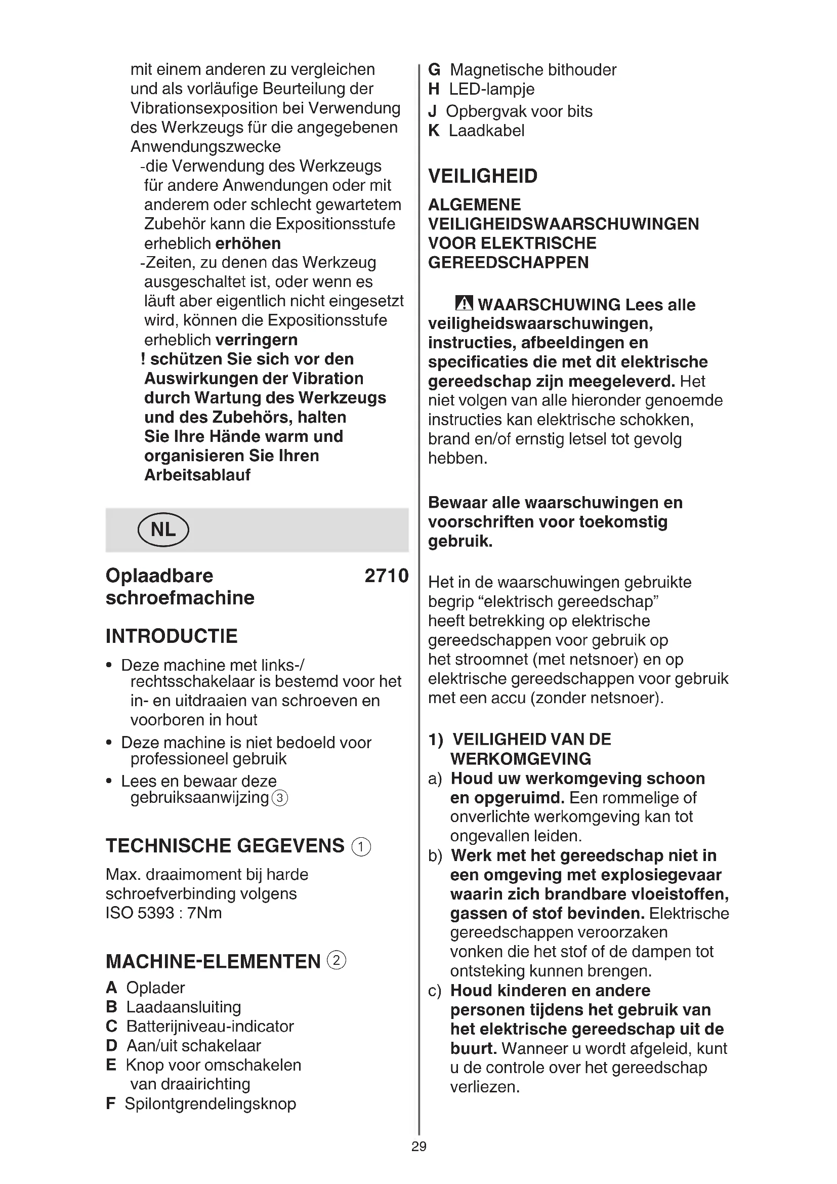 - Sollte das Elektrowerkzeug/Ladegerät trotz sorgfältiger Herstellungs- und Prüfverfahren einmal ausfallen, ist die Reparatur von einer autorisierten Kundendienststelle für SKIL- Elektrowerkzeuge ausführen zu lassen - das Werkzeug oder Ladegerät unzerlegt, zusammen mit dem Kaufbeleg, an den Lieferer oder die29 G Magnetische bithouder H LED-lampje J Opbergvak voor bits K Laadkabel VEILIGHEID ALGEMENE VEILIGHEIDSWAARSCHUWINGEN VOOR ELEKTRISCHE GEREEDSCHAPPEN - WAARSCHUWING Lees alle veiligheidswaarschuwingen, instructies, afbeeldingen en specicaties die met dit elektrische gereedschap zijn meegeleverd. Het niet volgen van alle hieronder genoemde instructies kan elektrische schokken, brand en/of ernstig letsel tot gevolg hebben. Bewaar alle waarschuwingen en voorschriften voor toekomstig gebruik. Het in de waarschuwingen gebruikte begrip “elektrisch gereedschap” heeft betrekking op elektrische gereedschappen voor gebruik op het stroomnet (met netsnoer) en op elektrische gereedschappen voor gebruik met een accu (zonder netsnoer).