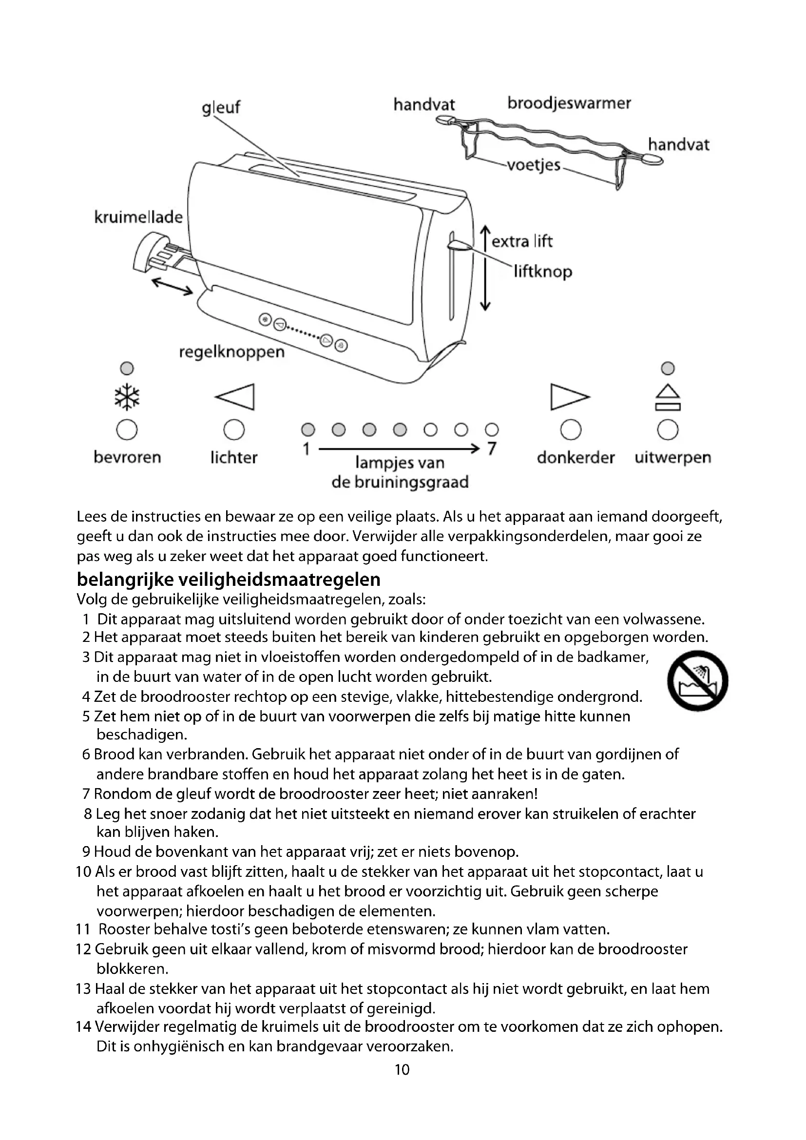 - Dit kan een lichte geur verspreiden, maar hier hoeft u zich geen zorgen om te maken. Zorg voor goede ventilatie. brood roosteren 1 Zet de broodrooster rechtop op een stevige, vlakke, hittebestendige ondergrond. 2 Zet hem niet op of in de buurt van voorwerpen die zelfs bij matige hitte kunnen beschadigen. 3 Brood kan verbranden. Gebruik het apparaat niet onder of in de buurt van gordijnen of andere brandbare stoffen en houd het apparaat zolang het heet is in de gaten. 4 Steek de stekker in het stopcontact. 5 Het apparaat voert eerst een zelfcontrole uit. 6 De vier linkerlampjes van de bruiningsgraad gaan aan. 7 Gebruik de knoppen aan een van beide uiteinden van de lampjes van de bruiningsgraad voor lichter % of donkerder & brood. 8 De lampjes van de bruiningsgraad gaan aan/uit om de gekozen bruiningsgraad aan te geven. 9 Hoe meer lampjes er branden, des te donkerder het brood wordt. 10 Plaats brood in de gleuf (maximale dikte 2,8 cm). 11 Druk de liftknop helemaal naar beneden. , Hij blijft alleen naar beneden gedrukt als de stekker van de broodrooster in het stopcontact zit. 12 De lichtjes van de bruiningsgraad tellen af: a) het rechterlampje knippert, het lampje links ervan brandt b) het rechter lampje gaat uit, het lampje links ervan knippert c) dit gaat door tot alle lampjes uit zijn d) als alle lampjes uit zijn wordt het geroosterde brood uitgeworpen. uitwerpen $ 13 Om de toaster halverwege te stoppen drukt u op $. 14 Het $ lampje gaat branden, het geroosterde broodje wordt uitgeworpen, dan gaat het $ lampje weer uit. instructies12 extra lift 15 Na het roosteren van kleine etenswaren (bagels, beschuitbollen enz.) kunt u de liftknop verder omhoog tillen, zodat u ze gemakkelijker uit de broodrooster kunt halen. bevroren brood f 16 Laat de bruiningsbediening op uw favoriete instelling staan, voer het bevroren brood in, doe de liftknop omlaag en raak f aan. 17 Het lampje “f” gaat aan en de roostertijd wordt automatisch gewijzigd om dezelfde bruiningsgraad te verkrijgen als bij brood dat niet bevroren is. broodjeswarmer , Als u de broodjeswarmer gebruikt, mag u de bruiningsgraad niet hoger dan 1 instellen. 18 Gebruik de broodjeswarmer niet om bevroren, geboterde, bestreken, gevulde broodjes of broodjes met een suikerlaag op te warmen. 19 Plaats de broodjeswarmer bovenop de broodrooster met de voetjes in de gleuf. 20 Plaats de broodjes bovenop de broodjeswarmer. 21 Stel de bruiningsgraad in op 1 en laat dan liftknop zakken. 22 Wanneer het liftknop opspringt, verwijdert u de opgewarmde broodjes. 23 Raak de draden van de broodjeswarmer niet aan – deze zijn heet. 24 Verwijder de broodjeswarmer alvorens de broodrooster normaal te gebruiken. geroosterd brood opnieuw opwarmen 25 Gebruik de laagste stand. Warm alleen geroosterd brood zonder boter of beleg opnieuw op. aanwijzingen en tips 26 Gebruik bij het roosteren van meerdere sneeën brood, brood van dezelfde grootte, dikte en versheid. 27 Oud brood bevat minder vocht, waardoor het knapperiger geroosterd brood wordt. 28 Oud of dun brood wordt sneller bruin dan vers of dik brood. Gebruik een lagere stand. 29 Zoete broodproducten (krentenbollen, krentenbrood e.d.) worden veel sneller bruin dan gewoon brood en dienen dan ook op een lagere stand te worden geroosterd. zorg en onderhoud 30 Haal de stekker van de broodrooster uit het stopcontact en laat hem afkoelen. 31 Neem de buitenkant van de mixer af met een vochtige doek. 32 Verwijder de kruimellade en maak hem leeg. Neem de kruimellade met een vochtige doek af, droog hem en breng hem weer aan in de broodrooster. 33 Gebruik de broodrooster alleen met de kruimmellade eronder. 34 Dompel het apparaat niet onder in water of een andere vloeistof. 35 Gebruik geen agressieve of schurende reinigingsmiddelen of oplossingen. symbool van vuilcontainer Om milieu- en gezondheidsproblemen als gevolg van gevaarlijke stoffen in elektrische en elektronische producten te vermijden, mogen apparaten met dit symbool niet worden weggegooid met niet-gesorteerd gemeentelijk afval, maar moeten ze worden teruggewonnen, opnieuw gebruikt of gerecycled.1314 Leggere attentamente le istruzioni e conservarle. Se l’apparecchio viene ceduto a terzi, passare anche le istruzioni. Rimuovere tutto il materiale d’imballaggio, ma conservarlo fino a quando si è certi che l’apparecchio funzioni. norme di sicurezza importanti Osservare le precauzioni fondamentali di sicurezza, e in particolare quanto segue: 1 Questo apparecchio deve essere usato solo da un adulto responsabile, o sotto il suo controllo. 2 Utilizzare e riporre l’apparecchio lontano dalla portata dei bambini. 3 Non immergere l’apparecchio nei liquidi, non usarlo nella stanza da bagno, in prossimità dell’acqua o all’aperto. 4 Posizionare verticalmente il tostapane su una superficie stabile, in pari e resistente al calore. 5 Non metterlo sopra o vicino ad oggetti che potrebbero essere danneggiati anche da temperature moderate. 6 Il pane potrebbe bruciare, per cui non usare il tostapane sotto o vicino a tende od altri materiali infiammabili, e tenerlo d’occhio mentre è caldo. 7 L’area circostante la fenditura di tostatura diventa molto calda: non toccarla! 8 Sistemare il cavo d’alimentazione in modo che non penzoli, non ci si possa impigliare o inciampare. 9 Non coprire l’apparecchio, e non metterci sopra niente. 10 Se il pane s’inceppa, staccare la spina del tostapane, lasciarlo raffreddare e rimuovere il pane con attenzione. Non usare per far questo oggetti appuntiti o taglienti, altrimenti si potrebbero danneggiare gli elementi. 11 Non tostare articoli “imburrati”, poiché potrebbero incendiarsi. 12 Non usare fette di pane lacerate, arricciate o di forma irregolare, poiché potrebbero fare inceppare il tostapane. 13 Togliere il filo della spina dalla presa della corrente quando non state usando l’apparecchio e lasciarlo raffreddare prima di spostarlo o pulirlo.15 istruzioni per l’uso 14 Ripulire frequentemente il tostapane dalle bri