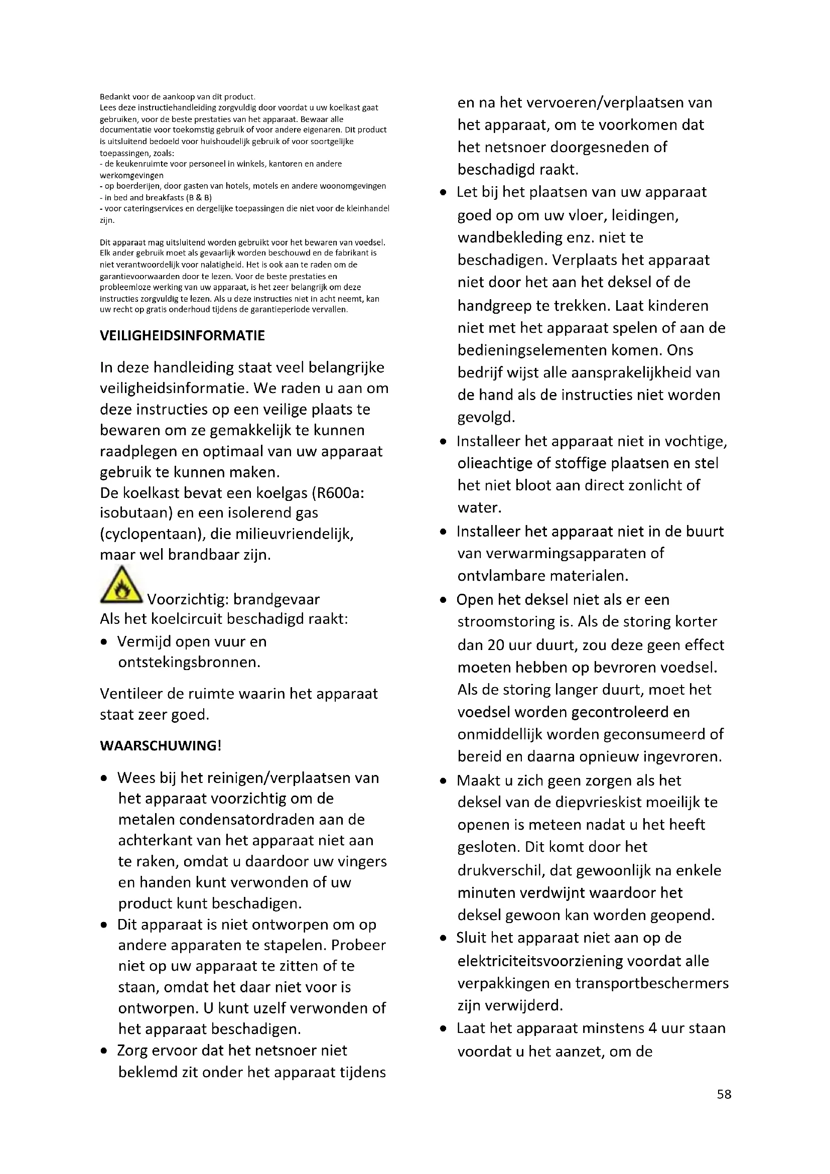 - Deze vriezer mag alleen worden gebruikt voor het beoogde doel (d.w.z. het bewaren en invriezen van eetbare voedingsmiddelen).