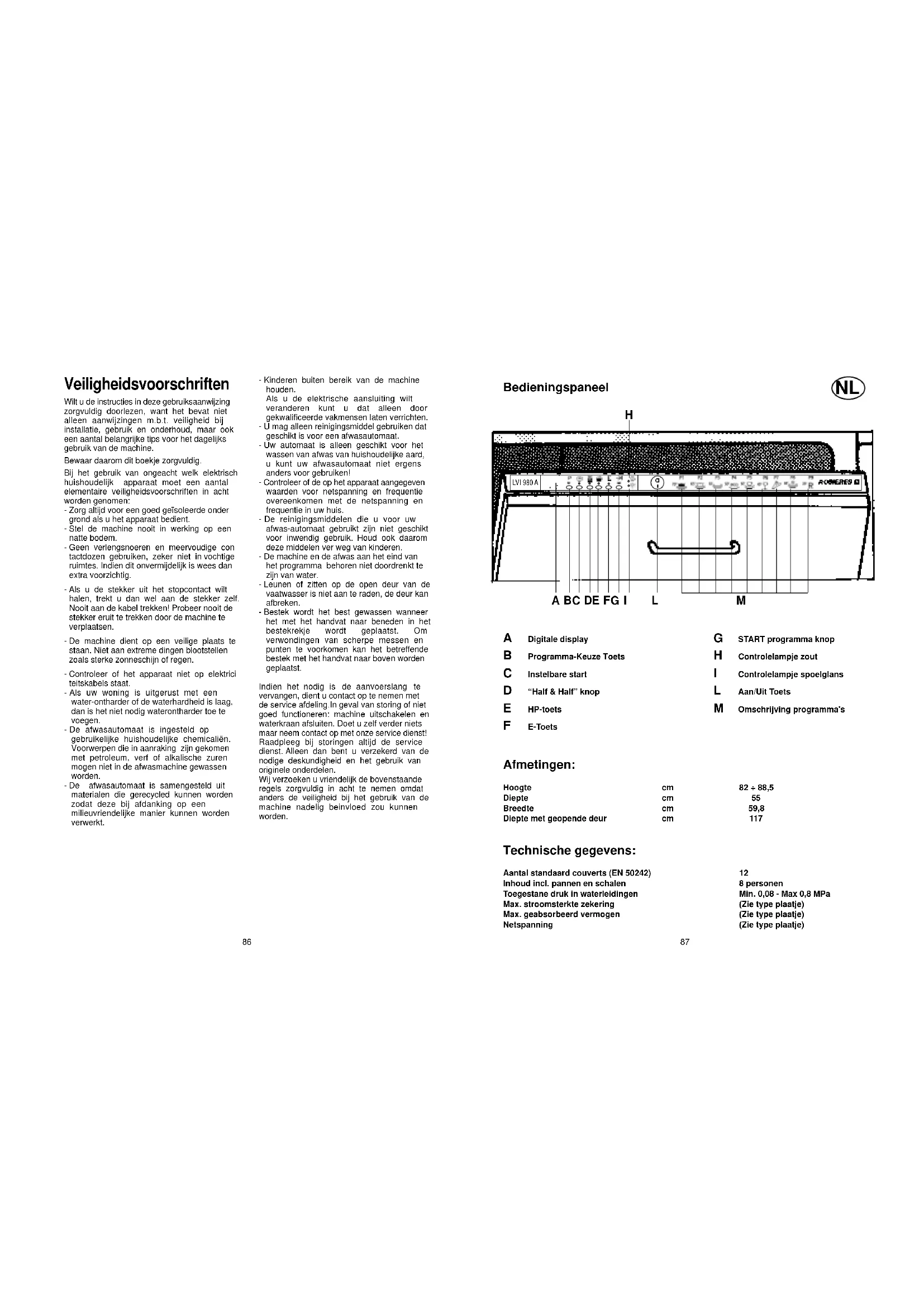 Digitale display B Programma-Keuze Toets C Instelbare start D “Half & Half” knop E HP-toets F E-Toets G START programma knop H Controlelampje zout I Controlelampje spoelglans L Aan/Uit Toets M Omschrijving programma's Afmetingen: Hoogte Diepte Breedte Diepte met geopende deur
