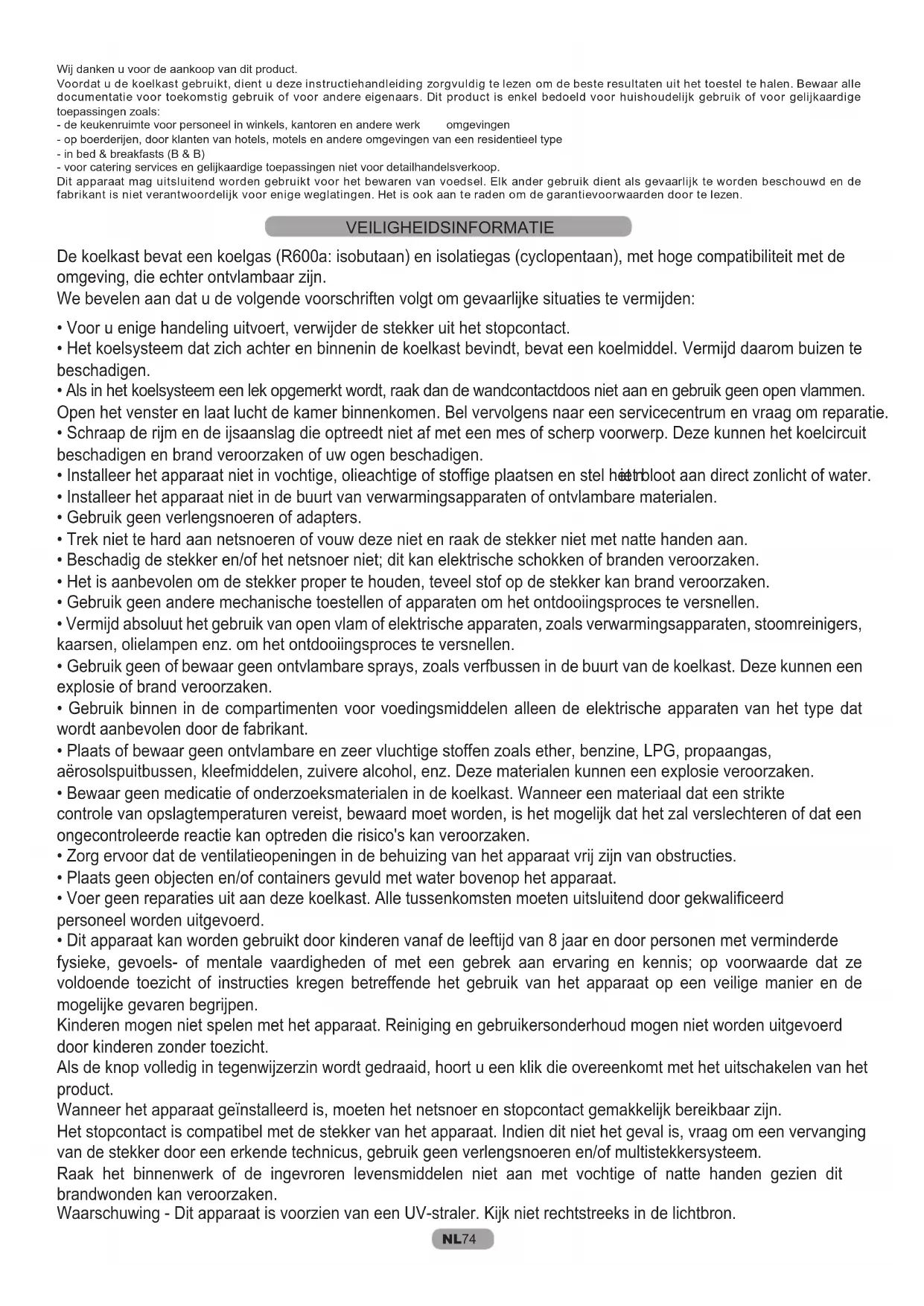 Wij danken u voor de aankoop van dit product. Voordat u de koelkast gebruikt, dient u deze instructiehandleiding zorgvuldig te lezen om de beste resultaten uit het toestel te halen. Bewaar alle documentatie voor toekomstig gebruik of voor andere eigenaars. Dit product is enkel bedoeld voor huishoudelijk gebruik of voor gelijkaardige toepassingen zoals: - de keukenruimte voor personeel in winkels, kantoren en andere werk omgevingen - op boerderijen, door klanten van hotels, motels en andere omgevingen van een residentieel type - in bed & breakfasts (B & B) - voor catering services en gelijkaardige toepassingen niet voor detailhandelsverkoop. Dit apparaat mag uitsluitend worden gebruikt voor het bewaren van voedsel. Elk ander gebruik dient als gevaarlijk te worden beschouwd en de fabrikant is niet verantwoordelijk voor enige weglatingen. Het is ook aan te raden om de garantievoorwaarden door te lezen. De koelkast bevat een koelgas (R600a: isobutaan) en isolatiegas (cyclopentaan), met hoge compatibiliteit met de omgeving, die echter ontvlambaar zijn. We bevelen aan dat u de volgende voorschriften volgt om gevaarlijke situaties te vermijden:
