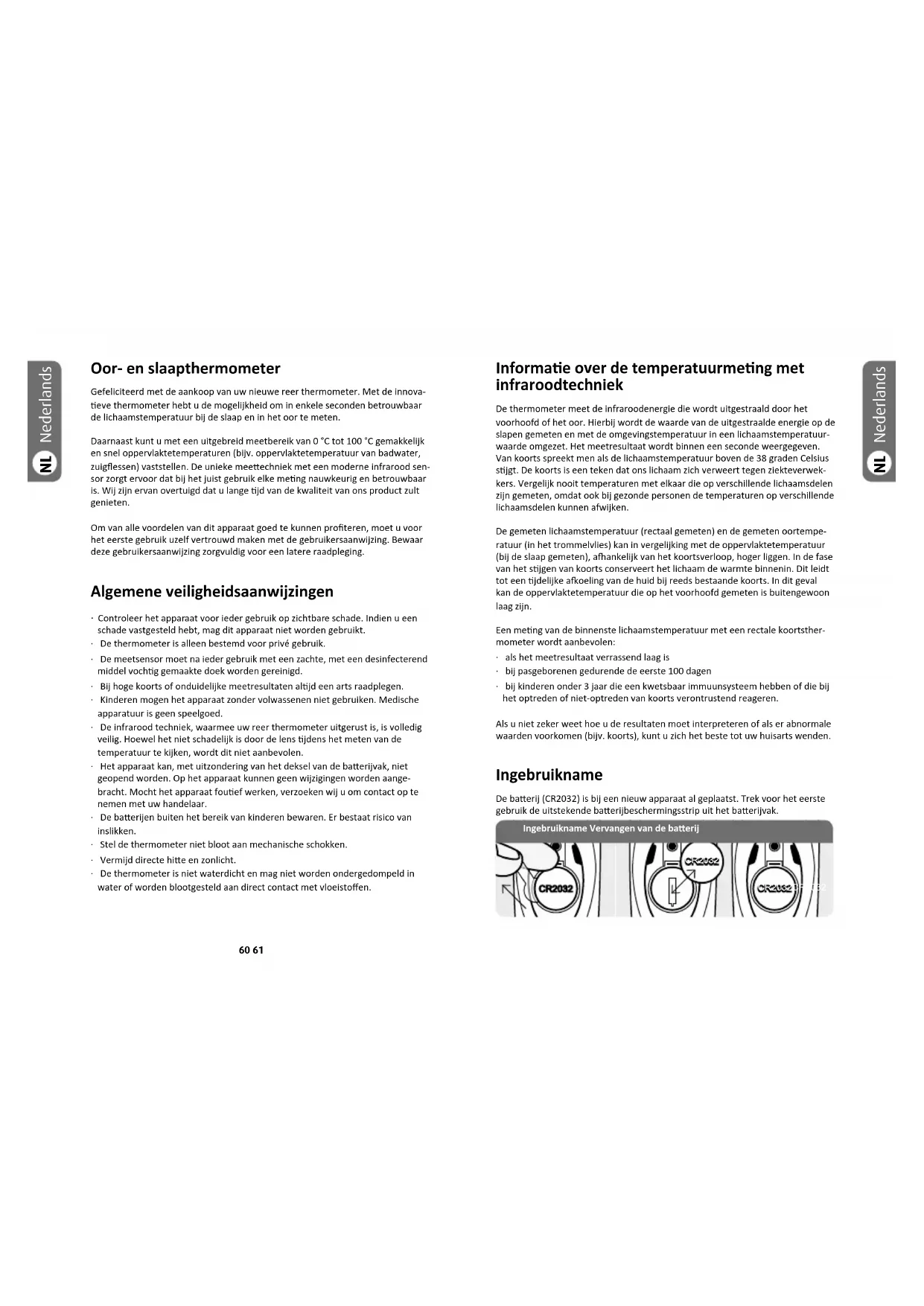- bij kinderen onder 3 jaar die een kwetsbaar immuunsysteem hebben of die bij het optreden of niet-optreden van koorts verontrustend reageren. Als u niet zeker weet hoe u de resultaten moet interpreteren of als er abnormale waarden voorkomen (bijv. koorts), kunt u zich het beste tot uw huisarts wenden. Ingebruikname De baerij (CR2032) is bij een nieuw apparaat al geplaatst. Trek voor het eerste gebruik de uitstekende baerijbeschermingsstrip uit het baerijvak. NL Nederlands Oor- en slaapthermometer Gefeliciteerd met de aankoop van uw nieuwe reer thermometer. Met de innova- eve thermometer hebt u de mogelijkheid om in enkele seconden betrouwbaar de lichaamstemperatuur bij de slaap en in het oor te meten. Daarnaast kunt u met een uitgebreid meetbereik van 0 °C tot 100 °C gemakkelijk en snel oppervlaktetemperaturen (bijv. oppervlaktetemperatuur van badwater, zuigessen) vaststellen. De unieke meeechniek met een moderne infrarood sen- sor zorgt ervoor dat bij het juist gebruik elke meng nauwkeurig en betrouwbaar is. Wij zijn ervan overtuigd dat u lange jd van de kwaliteit van ons product zult genieten. Om van alle voordelen van dit apparaat goed te kunnen proteren, moet u voor het eerste gebruik uzelf vertrouwd maken met de gebruikersaanwijzing. Bewaar deze gebruikersaanwijzing zorgvuldig voor een latere raadpleging. Algemene veiligheidsaanwijzingen