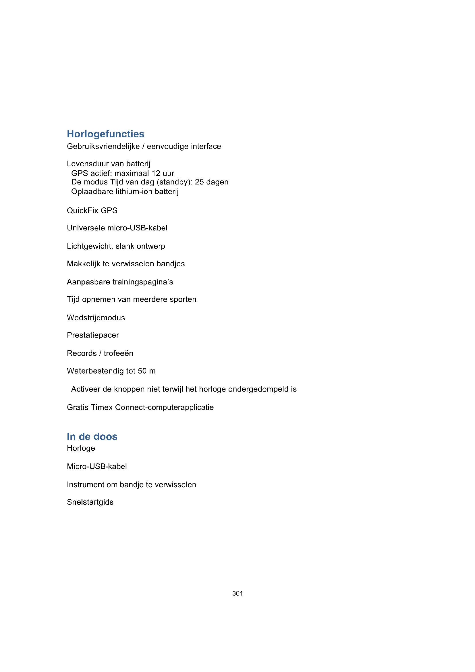 Horlogefuncties Gebruiksvriendelijke / eenvoudige interface Levensduur van batterij GPS actief: maximaal 12 uur De modus Tijd van dag (standby): 25 dagen Oplaadbare lithium-ion batterij QuickFix GPS Universele micro-USB-kabel Lichtgewicht, slank ontwerp Makkelijk te verwisselen bandjes Aanpasbare trainingspagina’s Tijd opnemen van meerdere sporten Wedstrijdmodus Prestatiepacer Records / trofeeën Waterbestendig tot 50 m Activeer de knoppen niet terwijl het horloge ondergedompeld is Gratis Timex Connect-computerapplicatie In de doos Horloge Micro-USB-kabel Instrument om bandje te verwisselen Snelstartgids362 Aan de slag In deze gebruikershandleiding worden alle functies van uw nieuwe TIMEX