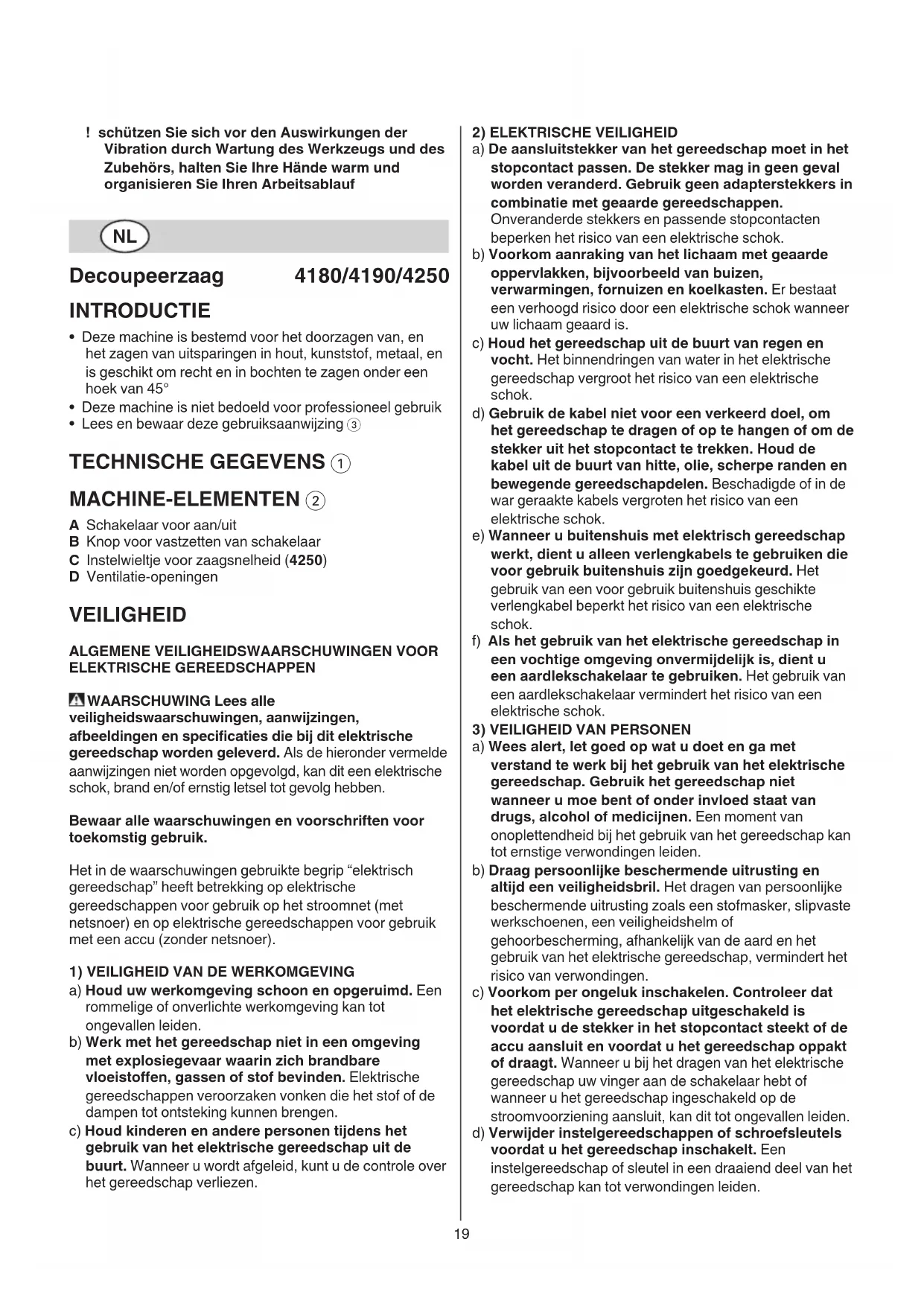 - Lees en bewaar deze gebruiksaanwijzing 3 TECHNISCHE GEGEVENS 1 MACHINE-ELEMENTEN 2 A Schakelaar voor aan/uit B Knop voor vastzetten van schakelaar C Instelwieltje voor zaagsnelheid (4250) D Ventilatie-openingen VEILIGHEID