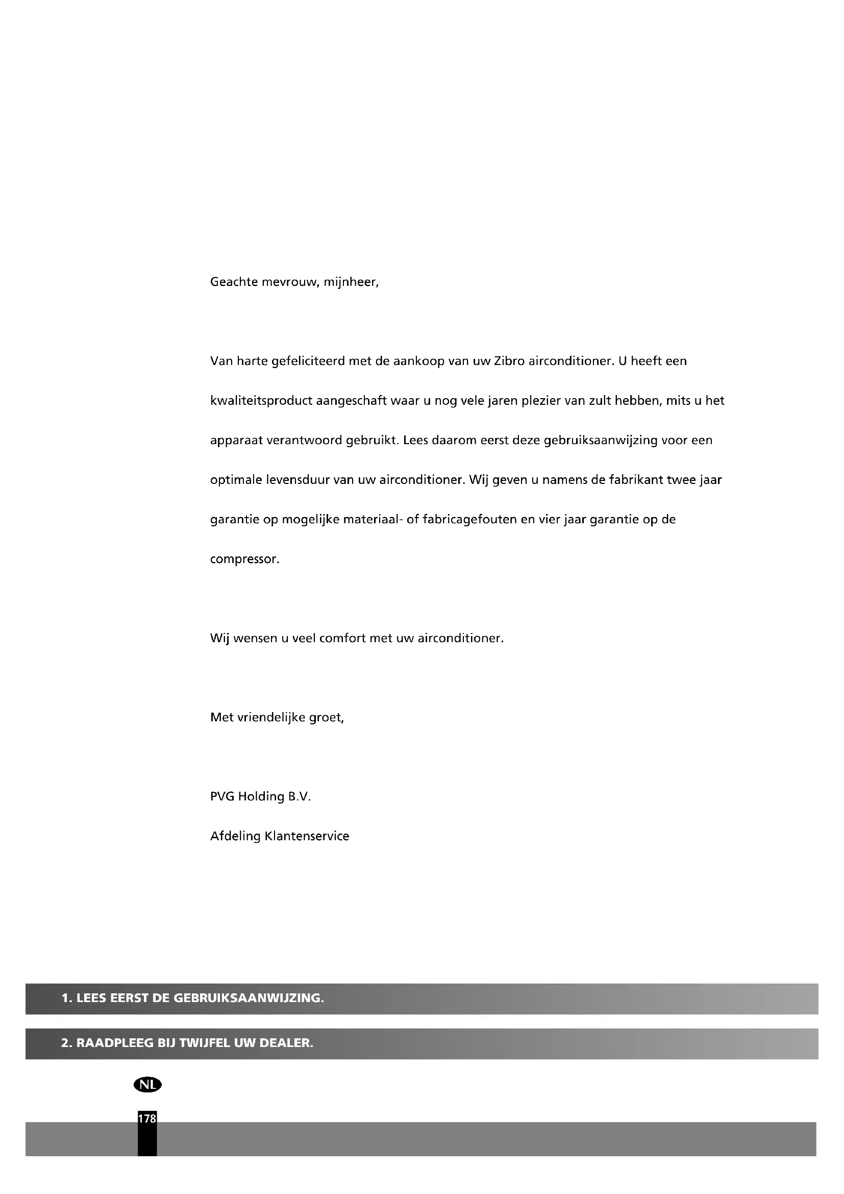 Geachte mevrouw, mijnheer, Van harte gefeliciteerd met de aankoop van uw Zibro airconditioner. U heeft een kwaliteitsproduct aangeschaft waar u nog vele jaren plezier van zult hebben, mits u het apparaat verantwoord gebruikt. Lees daarom eerst deze gebruiksaanwijzing voor een optimale levensduur van uw airconditioner. Wij geven u namens de fabrikant twee jaar garantie op mogelijke materiaal- of fabricagefouten en vier jaar garantie op de compressor. Wij wensen u veel comfort met uw airconditioner. Met vriendelijke groet, PVG Holding B.V. Afdeling Klantenservice man_S(C)36xx.qxd:man_S18xx 15-03-13 13:46 Page 1781
