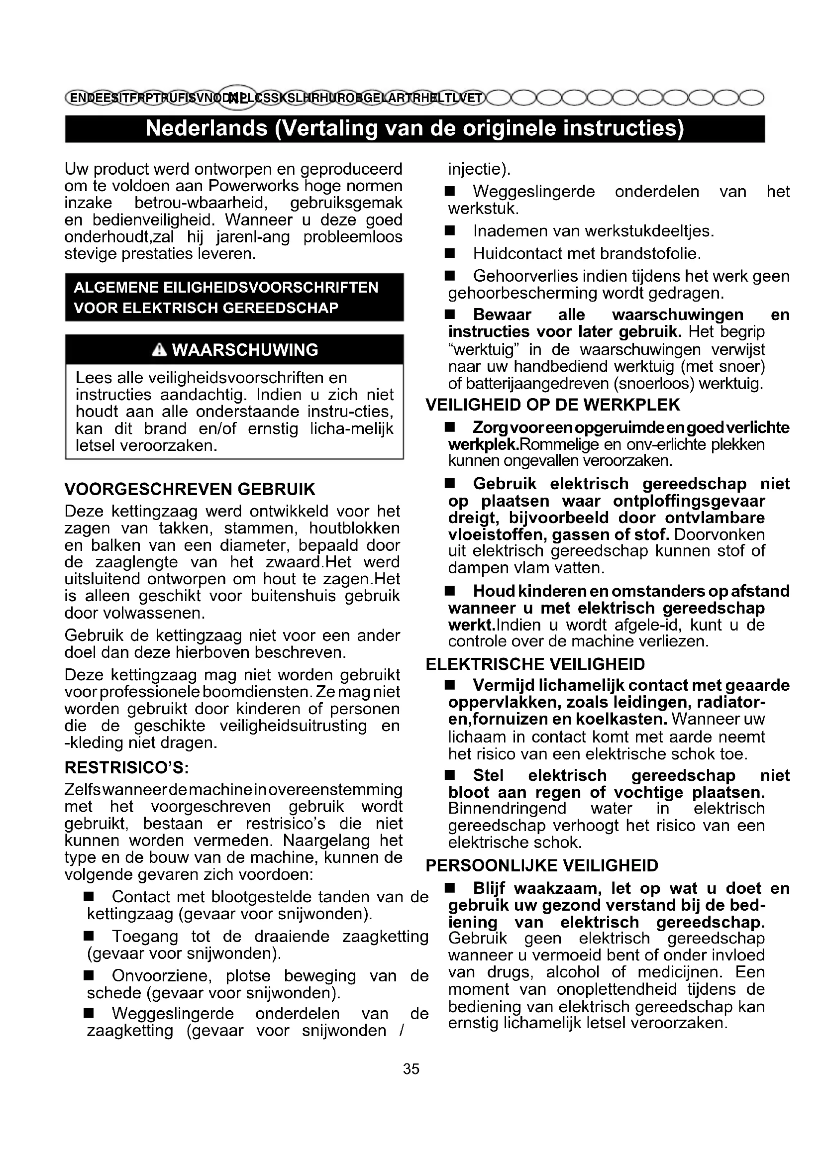 EN DE ES IT FR PT RU FI SV NO DA PL CS SK SL HR HU RO BG EL AR TR HE LT LV ET Uw product werd ontworpen en geproduceerd om te voldoen aan Powerworks hoge normen inzake betrou-wbaarheid, gebruiksgemak en bedienveiligheid. Wanneer u deze goed onderhoudt,zal hij jarenl-ang probleemloos stevige prestaties leveren. ALGEMENE EILIGHEIDSVOORSCHRIFTEN