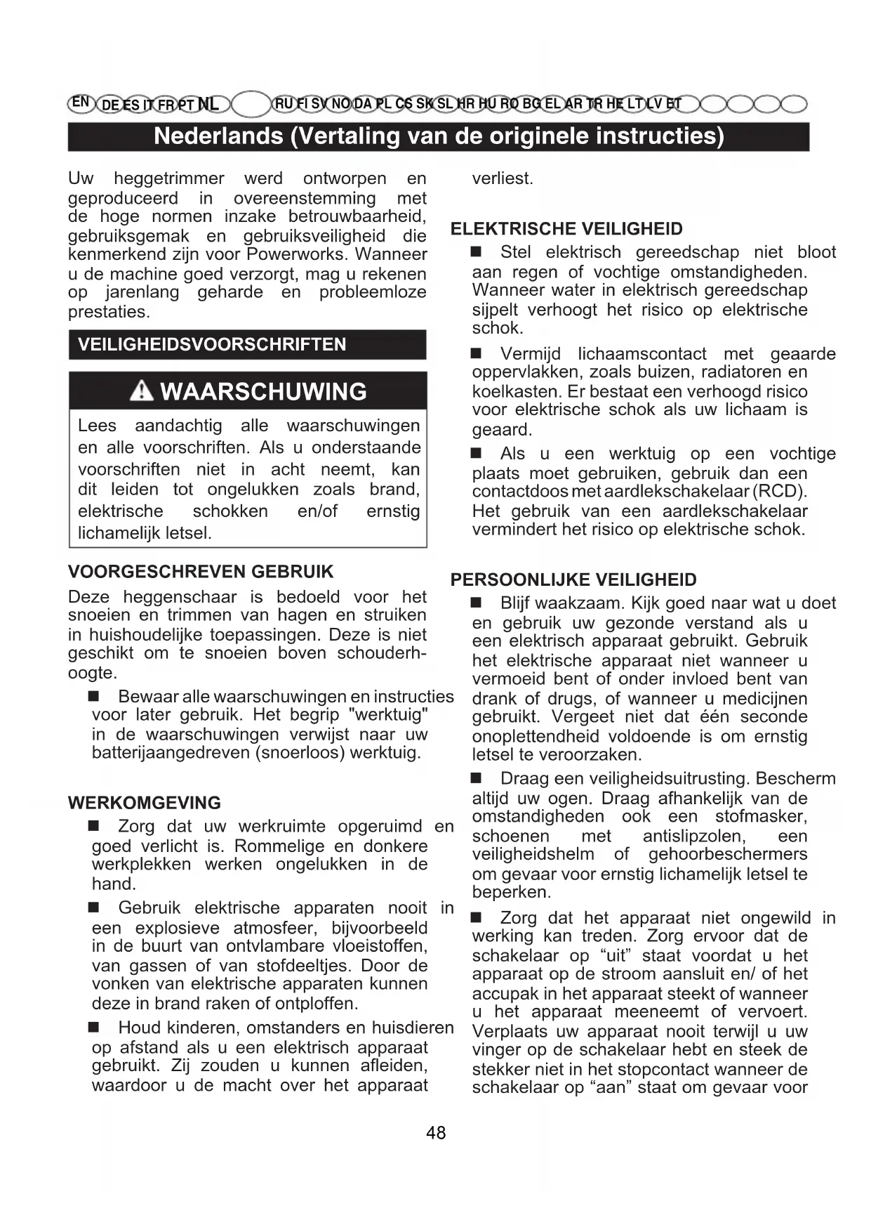DE ES IT FR PT NL RU FI SV NO DA PL CS SK SL HR HU RO BG EL AR TR HE LT LV ET Uw heggetrimmer werd ontworpen en geproduceerd in overeenstemming met de hoge normen inzake betrouwbaarheid, gebruiksgemak en gebruiksveiligheid die kenmerkend zijn voor Powerworks. Wanneer u de machine goed verzorgt, mag u rekenen op jarenlang geharde en probleemloze prestaties. VEILIGHEIDSVOORSCHRIFTEN WAARSCHUWING Lees aandachtig alle waarschuwingen en alle voorschriften. Als u onderstaande voorschriften niet in acht neemt, kan dit leiden tot ongelukken zoals brand, elektrische schokken en/of ernstig lichamelijk letsel. VOORGESCHREVEN GEBRUIK Deze heggenschaar is bedoeld voor het snoeien en trimmen van hagen en struiken in huishoudelijke toepassingen. Deze is niet geschikt om te snoeien boven schouderh- oogte. Bewaar alle waarschuwingen en instructies voor later gebruik. Het begrip "werktuig" in de waarschuwingen verwijst naar uw batterijaangedreven (snoerloos) werktuig. WERKOMGEVING Zorg dat uw werkruimte opgeruimd en goed verlicht is. Rommelige en donkere werkplekken werken ongelukken in de hand. Gebruik elektrische apparaten nooit in een explosieve atmosfeer, bijvoorbeeld in de buurt van ontvlambare vloeistoffen, van gassen of van stofdeeltjes. Door de vonken van elektrische apparaten kunnen deze in brand raken of ontploffen. Houd kinderen, omstanders en huisdieren op afstand als u een elektrisch apparaat gebruikt. Zij zouden u kunnen afleiden, waardoor u de macht over het apparaat verliest. ELEKTRISCHE VEILIGHEID Stel elektrisch gereedschap niet bloot aan regen of vochtige omstandigheden. Wanneer water in elektrisch gereedschap sijpelt verhoogt het risico op elektrische schok. Vermijd lichaamscontact met geaarde oppervlakken, zoals buizen, radiatoren en koelkasten. Er bestaat een verhoogd risico voor elektrische schok als uw lichaam is geaard. Als u een werktuig op een vochtige plaats moet gebruiken, gebruik dan een contactdoos met aardlekschakelaar (RCD). Het gebruik van een aardlekschakelaar vermindert het risico op elektrische schok. PERSOONLIJKE VEILIGHEID Blijf waakzaam. Kijk goed naar wat u doet en gebruik uw gezonde verstand als u een elektrisch apparaat gebruikt. Gebruik het elektrische apparaat niet wanneer u vermoeid bent of onder invloed bent van drank of drugs, of wanneer u medicijnen gebruikt. Vergeet niet dat één seconde onoplettendheid voldoende is om ernstig letsel te veroorzaken. Draag een veiligheidsuitrusting. Bescherm altijd uw ogen. Draag afhankelijk van de omstandigheden ook een stofmasker, schoenen met antislipzolen, een veiligheidshelm of gehoorbeschermers om gevaar voor ernstig lichamelijk letsel te beperken. Zorg dat het apparaat niet ongewild in werking kan treden. Zorg ervoor dat de schakelaar op “uit” staat voordat u het apparaat op de stroom aansluit en/ of het accupak in het apparaat steekt of wanneer u het apparaat meeneemt of vervoert. Verplaats uw apparaat nooit terwijl u uw vinger op de schakelaar hebt en steek de stekker niet in het stopcontact wanneer de schakelaar op “aan” staat om gevaar voor 48Nederlands (Vertaling van de originele instructies)