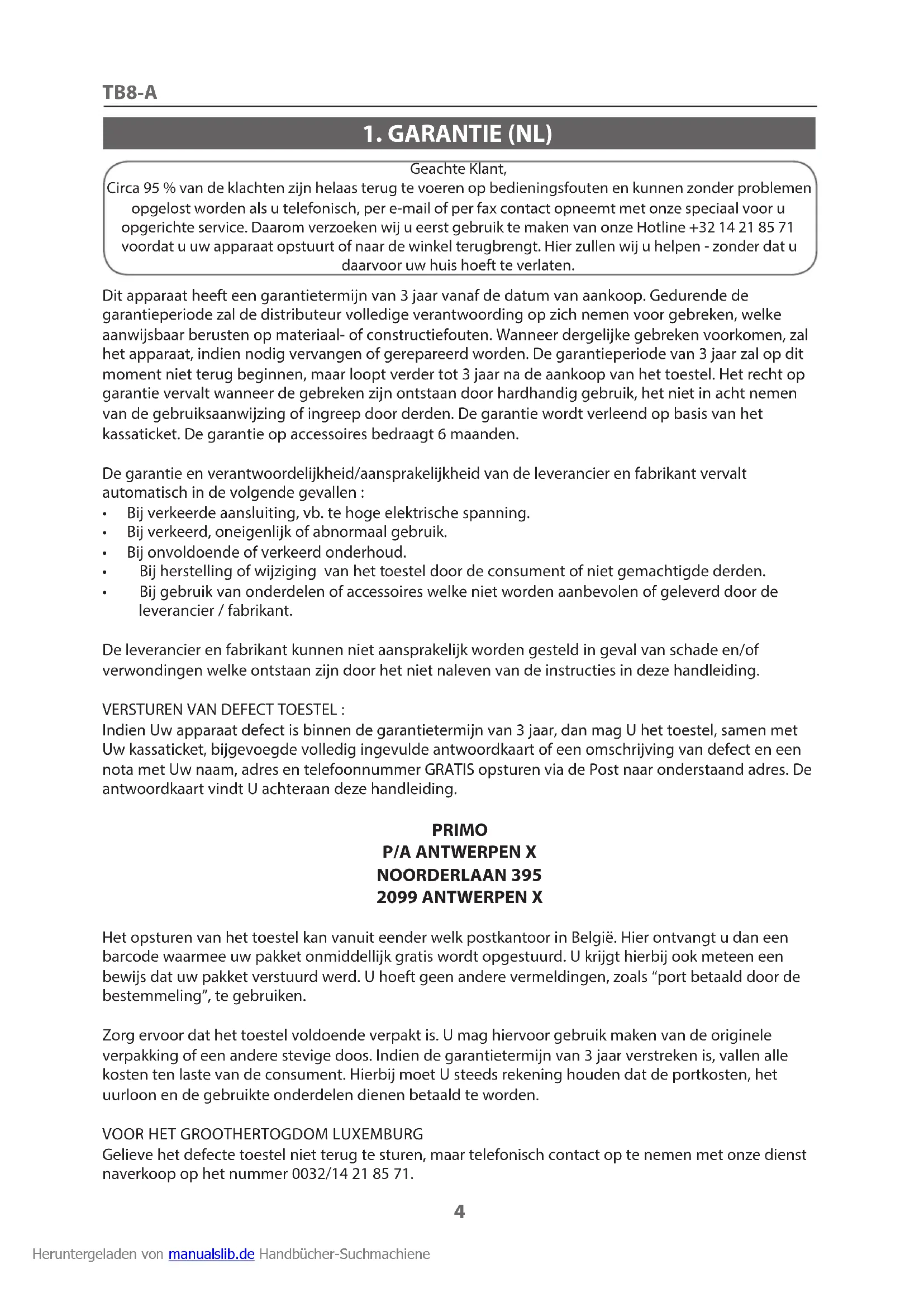 Gelieve het defecte toestel niet terug te sturen, maar telefonisch contact op te nemen met onze dienst naverkoop op het nummer 0032/14 21 85 71. Heruntergeladen von manualslib.de Handbücher-SuchmachieneTB8-A