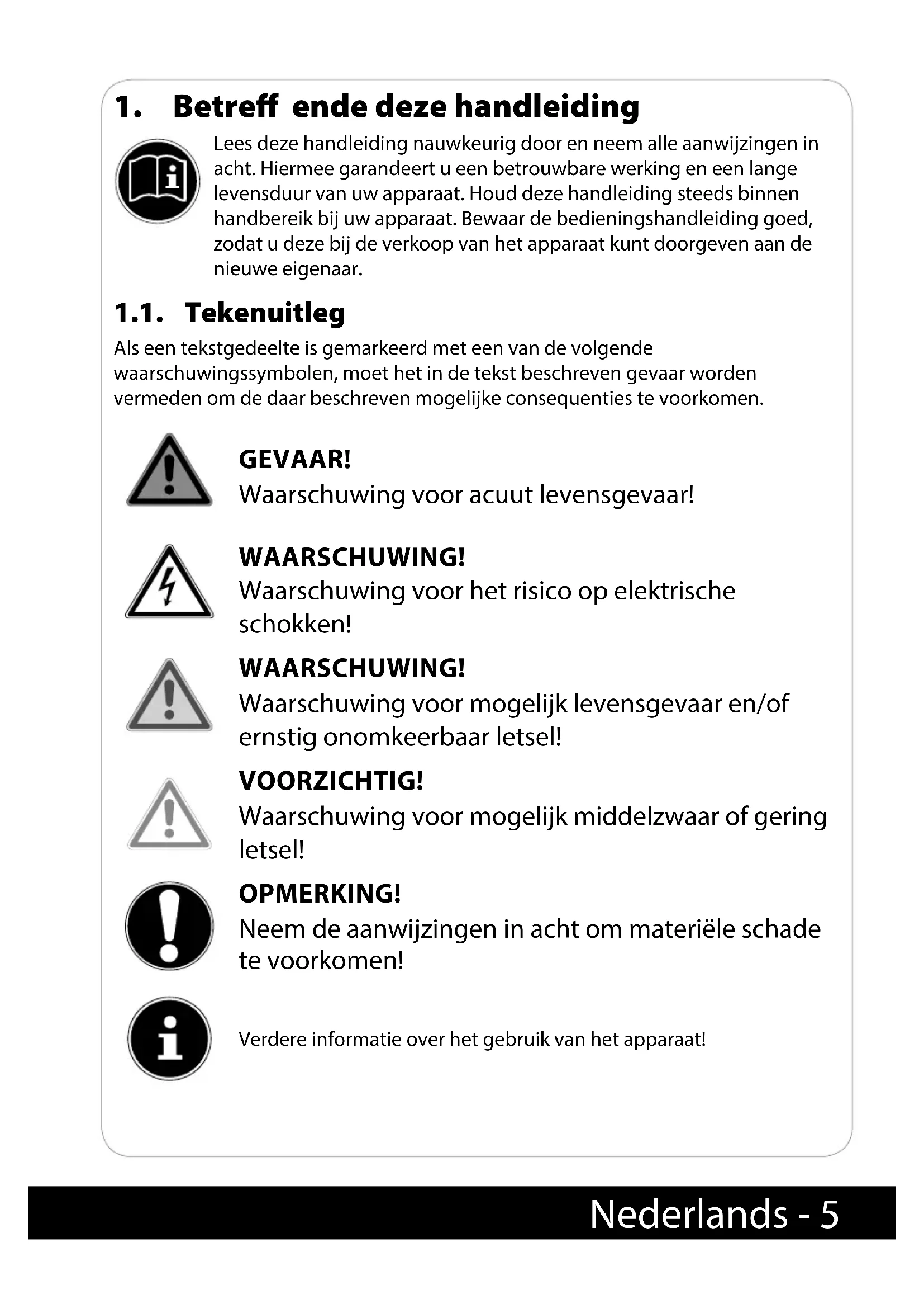 Lees deze handleiding nauwkeurig door en neem alle aanwijzingen in acht. Hiermee garandeert u een betrouwbare werking en een lange levensduur van uw apparaat. Houd deze handleiding steeds binnen handbereik bij uw apparaat. Bewaar de bedieningshandleiding goed, zodat u deze bij de verkoop van het apparaat kunt doorgeven aan de nieuwe eigenaar. 1.1. Tekenuitleg Als een tekstgedeelte is gemarkeerd met een van de volgende waarschuwingssymbolen, moet het in de tekst beschreven gevaar worden vermeden om de daar beschreven mogelijke consequenties te voorkomen. GEVAAR! Waarschuwing voor acuut levensgevaar! WAARSCHUWING! Waarschuwing voor het risico op elektrische schokken! WAARSCHUWING! Waarschuwing voor mogelijk levensgevaar en/of ernstig onomkeerbaar letsel! VOORZICHTIG! Waarschuwing voor mogelijk middelzwaar of gering letsel! OPMERKING! Neem de aanwijzingen in acht om materiële schade te voorkomen! Verdere informatie over het gebruik van het apparaat! 16550 BE-AN MSN 5005 9606 Content RC4.indb 516550 BE-AN MSN 5005 9606 Content RC4.indb 5 06.07.2018 11:47:0906.07.2018 11:47:096 - Nederlands Volg de aanwijzingen in de bedieningshandleiding op! Symbool voor wisselstroom Gebruik in binnenruimten Apparaten met dit symbool zijn uitsluitend geschikt voor gebruik in binnenruimten.