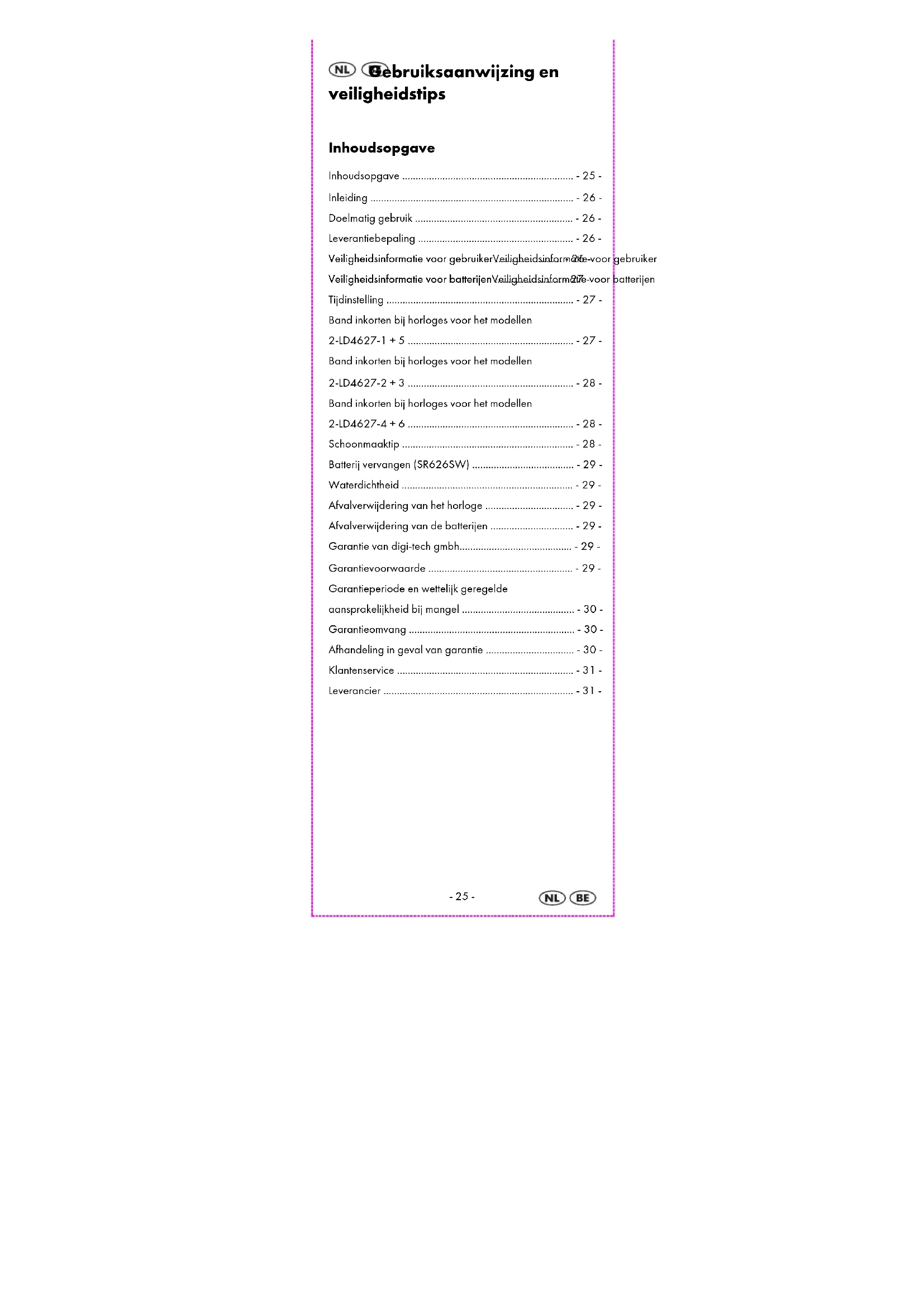 Gebruiksaanwijzing en veiligheidstips Inhoudsopgave Inhoudsopgave ................................................................ - 25 - Inleiding ............................................................................ - 26 - Doelmatig gebruik ........................................................... - 26 - Leverantiebepaling .......................................................... - 26 - Veiligheidsinformatie voor gebruiker Veiligheidsinformatie voor gebruikerVeiligheidsinformatie voor gebruiker Veiligheidsinformatie voor gebruiker ......................... - 26 - Veiligheidsinformatie voor batterijen Veiligheidsinformatie voor batterijenVeiligheidsinformatie voor batterijen Veiligheidsinformatie voor batterijen ......................... - 27 - Tijdinstelling ...................................................................... - 27 - Band inkorten bij horloges voor het modellen 2-LD4627-1 + 5 .............................................................. - 27 - Band inkorten bij horloges voor het modellen 2-LD4627-2 + 3 .............................................................. - 28 - Band inkorten bij horloges voor het modellen 2-LD4627-4 + 6 .............................................................. - 28 - Schoonmaaktip ................................................................ - 28 - Batterij vervangen (SR626SW) ...................................... - 29 - Waterdichtheid ................................................................ - 29 - Afvalverwijdering van het horloge ................................. - 29 - Afvalverwijdering van de batterijen ............................... - 29 - Garantie van digi-tech gmbh.......................................... - 29 - Garantievoorwaarde ...................................................... - 29 - Garantieperiode en wettelijk geregelde aansprakelijkheid bij mangel .......................................... - 30 - Garantieomvang .............................................................. - 30 - Afhandeling in geval van garantie ................................. - 30 - Klantenservice .................................................................. - 31 - Leverancier ....................................................................... - 31 --