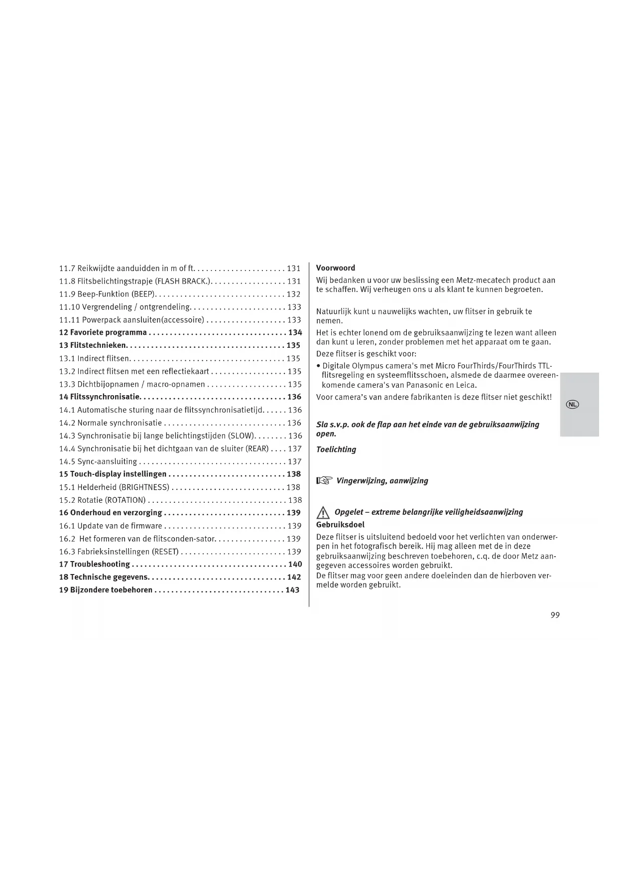 xVoorwoord Wij bedanken u voor uw beslissing een Metz-mecatech product aan te schaffen. Wij verheugen ons u als klant te kunnen begroeten. Natuurlijk kunt u nauwelijks wachten, uw flitser in gebruik te nemen. Het is echter lonend om de gebruiksaanwijzing te lezen want alleen dan kunt u leren, zonder problemen met het apparaat om te gaan. Deze flitser is geschikt voor: