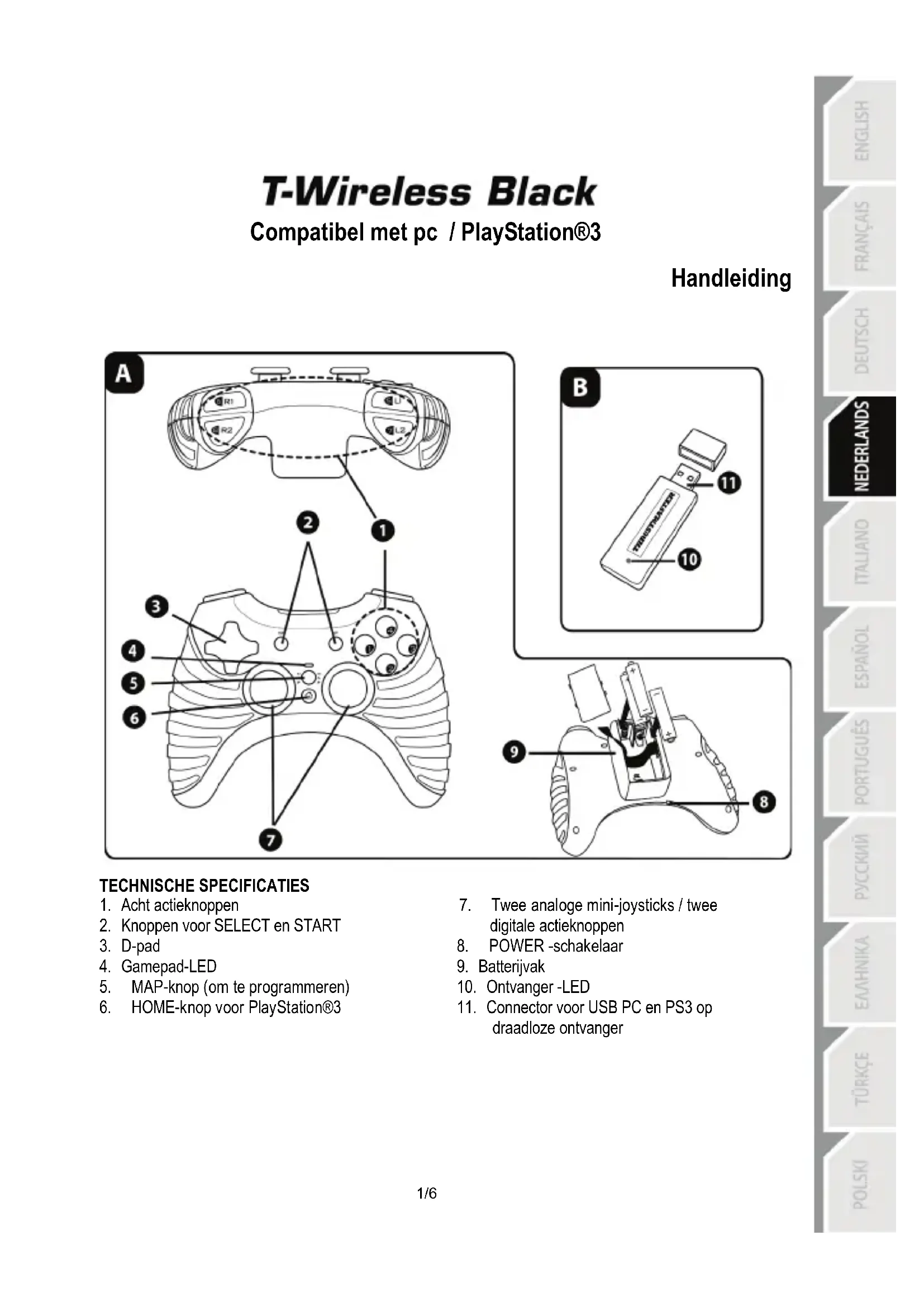- Ik kan mijn gamepad niet configureren: - Ga in de game naar het menu met opties voor de controller en de gamepad. Selecteer de meest geschikte configuratie. - Raadpleeg de handleiding of de online help van de game voor meer informatie. - U kunt ook de programmeerfunctie van uw gamepad gebruiken om dit soort problemen op te lossen. Wanneer u de gamepad niet meer gebruikt, adviseren wij de POWER-schakelaar (9) van de gamepad altijd in de OFF-stand te zetten om de batterijen te sparen.4/6 Informatie met betrekking tot kopersgarantie Wereldwijd garandeert Guillemot Corporation S.A., het statutair adres gevestigd aan de Place du Granier, B.P. 97143, 35571 Chantepie, Frankrijk, (hierna te noemen “Guillemot”) aan de de koper dat dit Thrustmaster-product vrij zal zijn van materiaal- en fabricagefouten gedurende een garantieperiode gelijk aan de tijd maximaal vereist om een restitutie/vervanging voor dit product te claimen. In landen van de Europese Unie komt dit overeen met een periode van twee (2) jaar vanaf het moment van levering van het Thrustmaster-product. In andere landen komt de garantieperiode overeen met de tijd maximaal vereist om een restitutie/vervanging voor dit Thrustmaster-product te claimen zoals wettelijk is vastgelegd in het land waarin de koper woonachtig was op de datum van aankoop van het Thrustmaster-product. Indien een dergelijk claimrecht niet wettelijk is vastgelegd in het betreffende land, geldt een garantieperiode van één (1) jaar vanaf datum aankoop van het Thrustmaster-product. Indien u in de garantieperiode een defect meent te constateren aan dit product, neem dan onmiddellijk contact op met Technical Support die u zal informeren over de te volgen procedure. Als het defect wordt bevestigd, dient het product te worden geretourneerd naar de plaats van aankoop (of een andere locatie die wordt opgegeven door Technical Support). Binnen het gestelde van deze garantie wordt het defecte product van de koper gerepareerd of vervangen, zulks ter beoordeling van Technical Support. Indien het Thrustmaster- product tijdens de garantieperiode is onderworpen aan een dergelijk herstel, wordt elke periode van ten minste zeven (7) dagen waarin het product niet in gebruik is, opgeteld bij de resterende garantieperiode (deze periode loopt vanaf de datum van verzoek van de consument voor interventie of vanaf de datum waarop het product in kwestie beschikbaar is gesteld voor herstel als de datum waarop het product ter beschikking wordt gesteld voor herstel later is dan de datum van het verzoek om interventie). Indien toegestaan door van toepassing zijnde wetgeving, beperkt de volledige aansprakelijkheid van Guillemot en haar dochterondernemingen (inclusief de aansprakelijkheid voor vervolgschade) zich tot het repareren of vervangen van het Thrustmaster-product. Indien toegestaan door van toepassing zijnde wetgeving, wijst Guillemot elke garantie af met betrekking tot verhandelbaarheid of geschiktheid voor enig doel. Deze garantie is niet van kracht: (1) indien het product aangepast, geopend of gewijzigd is, of beschadigd is ten gevolge van oneigenlijk of onvoorzichtig gebruik, verwaarlozing, een ongeluk, normale slijtage, of enige andere oorzaak die niet gerelateerd is aan een materiaal- of fabricagefout (inclusief maar niet beperkt tot het combineren van het Thrustmaster-product met enig ongeschikt element waaronder in het bijzonder voedingsadapters, oplaadbare batterijen, opladers of enig ander element niet geleverd door Guillemot voor dit product); (2) als het product is gebruikt voor enig ander doel dan thuisgebruik, zoals maar niet exclusief een professioneel of commercieel doel (bijvoorbeeld game rooms, training, wedstrijden); (3) indien u zich niet houdt aan de instructies zoals verstrekt door Technical Support; (4) op software die onder een specifieke garantie valt; (5) op verbruiksartikelen (elementen die tijdens de levensduur van het product worden vervangen zoals bijvoorbeeld batterijen of pads van een headset of koptelefoon); (6) op accessoires (zoals bijvoorbeeld kabels, behuizingen, hoesjes, etui's, draagtassen of polsbandjes); (7) indien het product werd verkocht op een openbare veiling. Deze garantie is niet overdraagbaar. De wettelijke rechten van de koper die in zijn/haar land van toepassing zijn op de verkoop van consumentproducten worden op generlei wijze door deze garantie beperkt.5/6 Aanvullende garantiebepalingen Gedurende de garantieperiode zal Guillemot in principe nooit reserveonderdelen leveren omdat Technical Support de enige partij is die bevoegd is een Thrustmaster-product te openen en/of te herstellen (met uitzondering van een herstelprocedure die de klant door Technical Support gevraagd wordt uit te voeren met behulp van schriftelijke instructies – omdat deze procedure bijvoorbeeld eenvoudig is en het herstelproces niet vertrouwelijk is – en door het verstrekken aan de consument van de benodigde onderdelen, indien van toepassing). Gezien de innovatiecycli en om haar knowhow en handelsgeheimen te beschermen, zal Guillemot in principe nooit een herstelbeschrijving of reserveonderdelen verstrekken voor een Thrustmaster-product waarvan de garantieperiode is verstreken. Aansprakelijkheid Indien toegestaan door van toepassing zijnde wetgeving, wijzen Guillemot Corporation S.A. (hierna te noemen “Guillemot”) en haar dochterondernemingen alle aansprakelijkheid af voor enige schade veroorzaakt door één van de volgende oorzaken: (1) indien het product aangepast, geopend of gewijzigd is; (2) de montage-instructies niet zijn opgevolgd; (3) oneigenlijk of onvoorzichtig gebruik, verwaarlozing, een ongeluk (bijvoorbeeld stoten); (4) normale slijtage; (5) het gebruik van het product voor enig ander doel dan thuisgebruik, zoals maar niet exclusief een professioneel of commercieel doel (bijvoorbeeld game rooms, training, wedstrijden). Indien toegestaan onder van toepassing zijnde wetgeving, wijzen Guillemot en haar dochterondernemingen alle aansprakelijkhe
